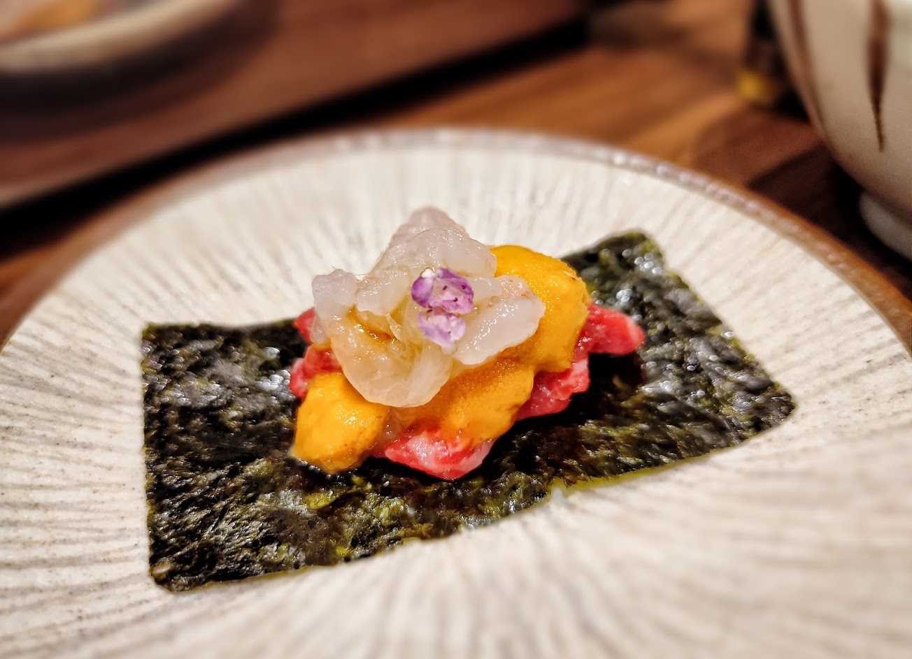 單點了店家推薦的海膽生牛肉,海苔包覆著生牛肉➕海膽,整口咬下驚喜滿分,這個有厲害?