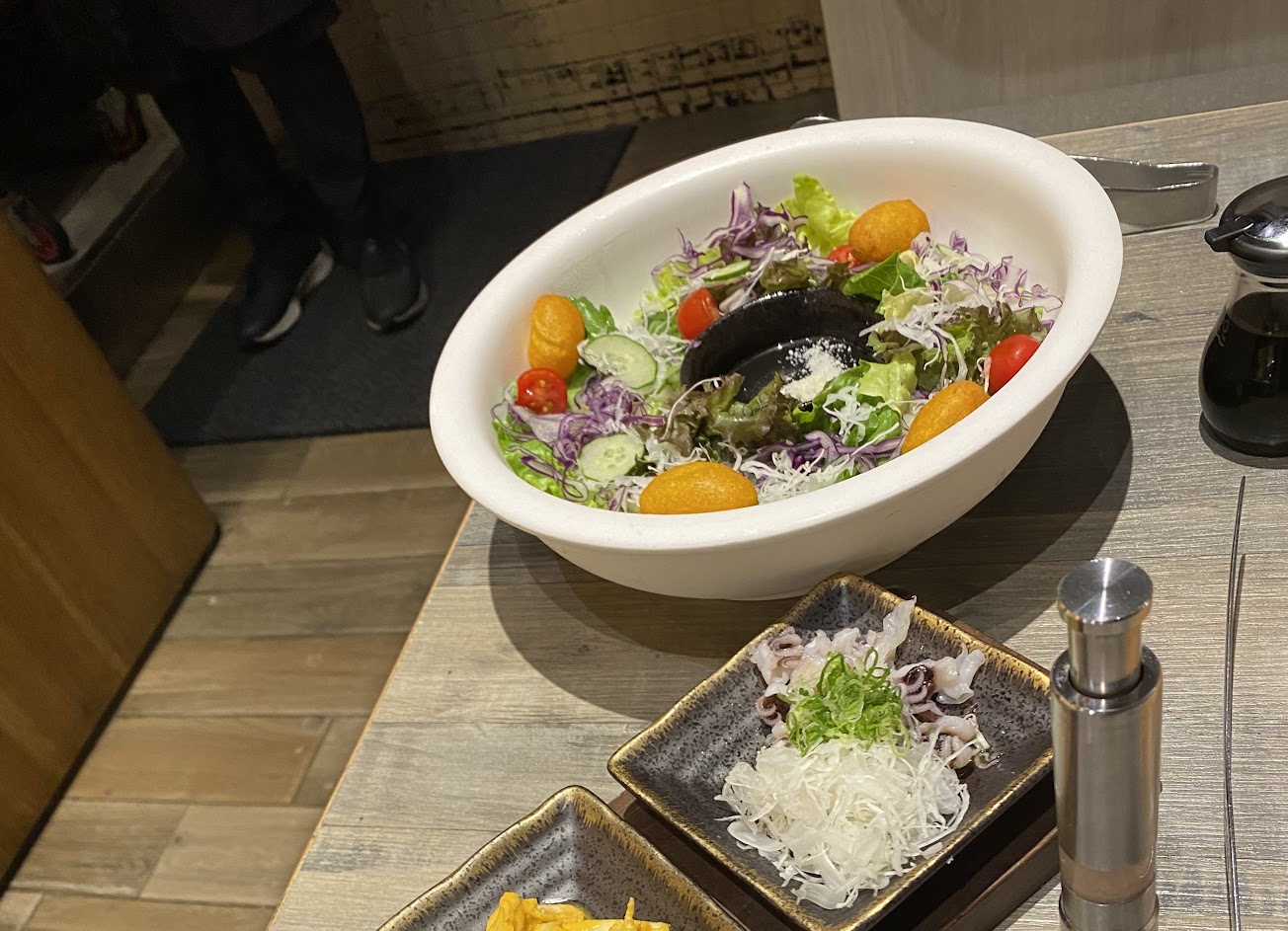 沙拉裡的地瓜球意外好吃,小菜的章魚和香腸也非常好吃