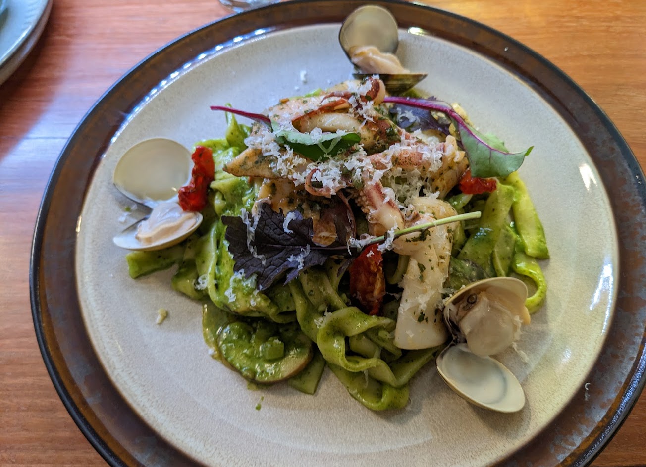 真的非常好吃。附圖是青醬透抽麵。麵體本身有嚼勁,且海鮮味完整入麵,青醬濃度剛好搭配海鮮與麵條~