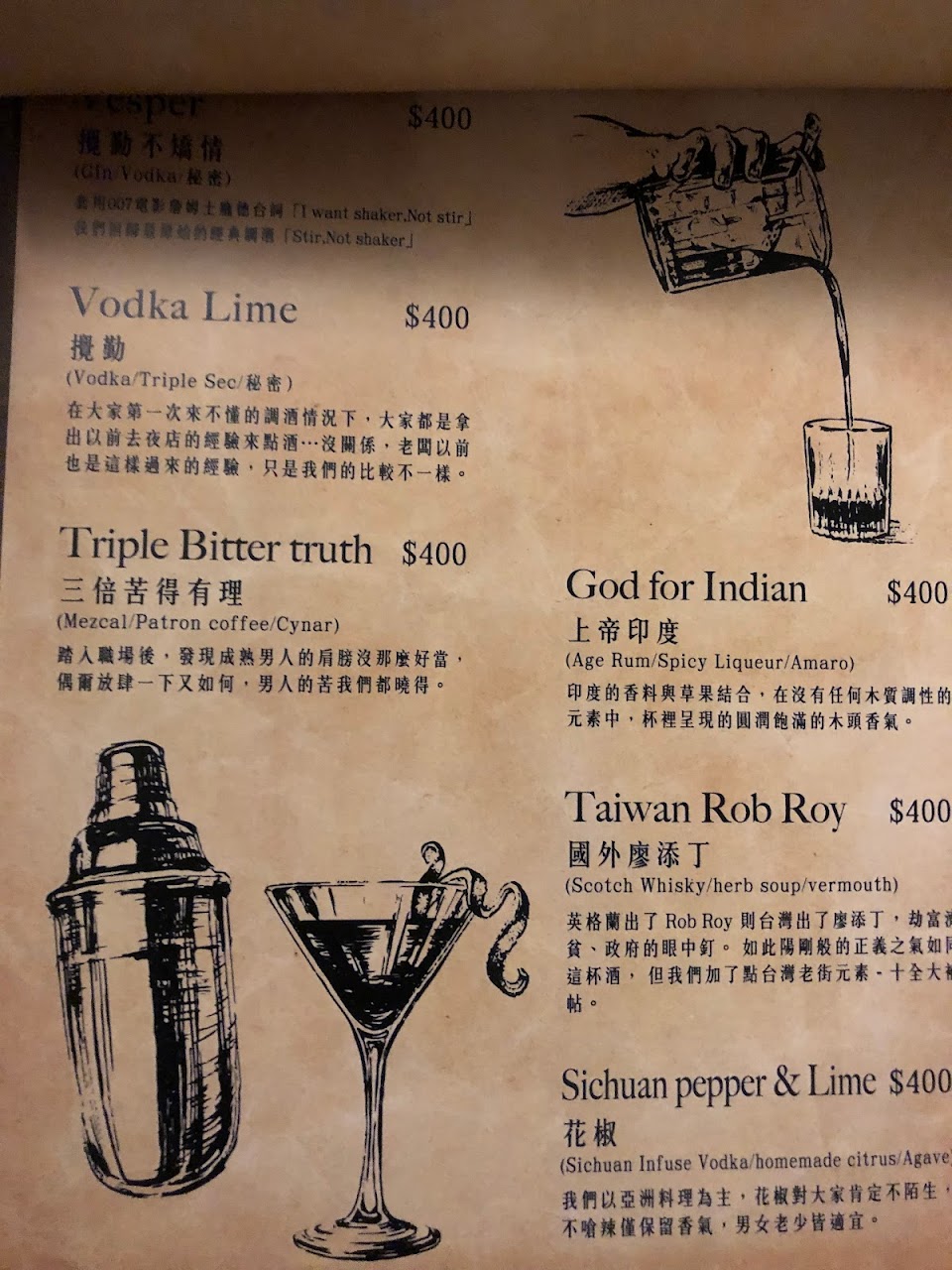 調酒真的很好喝,喝了八杯,沒有一杯是雷的,調酒師真的很厲害,可以依照喜好調出客人喜歡的酒感,酒基底也很好,很推薦!