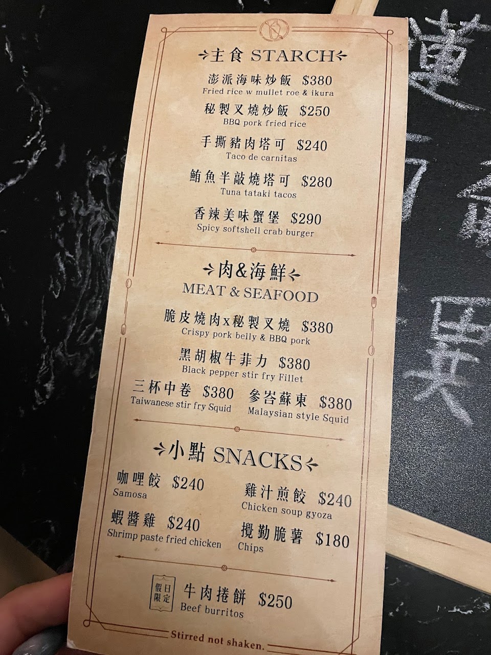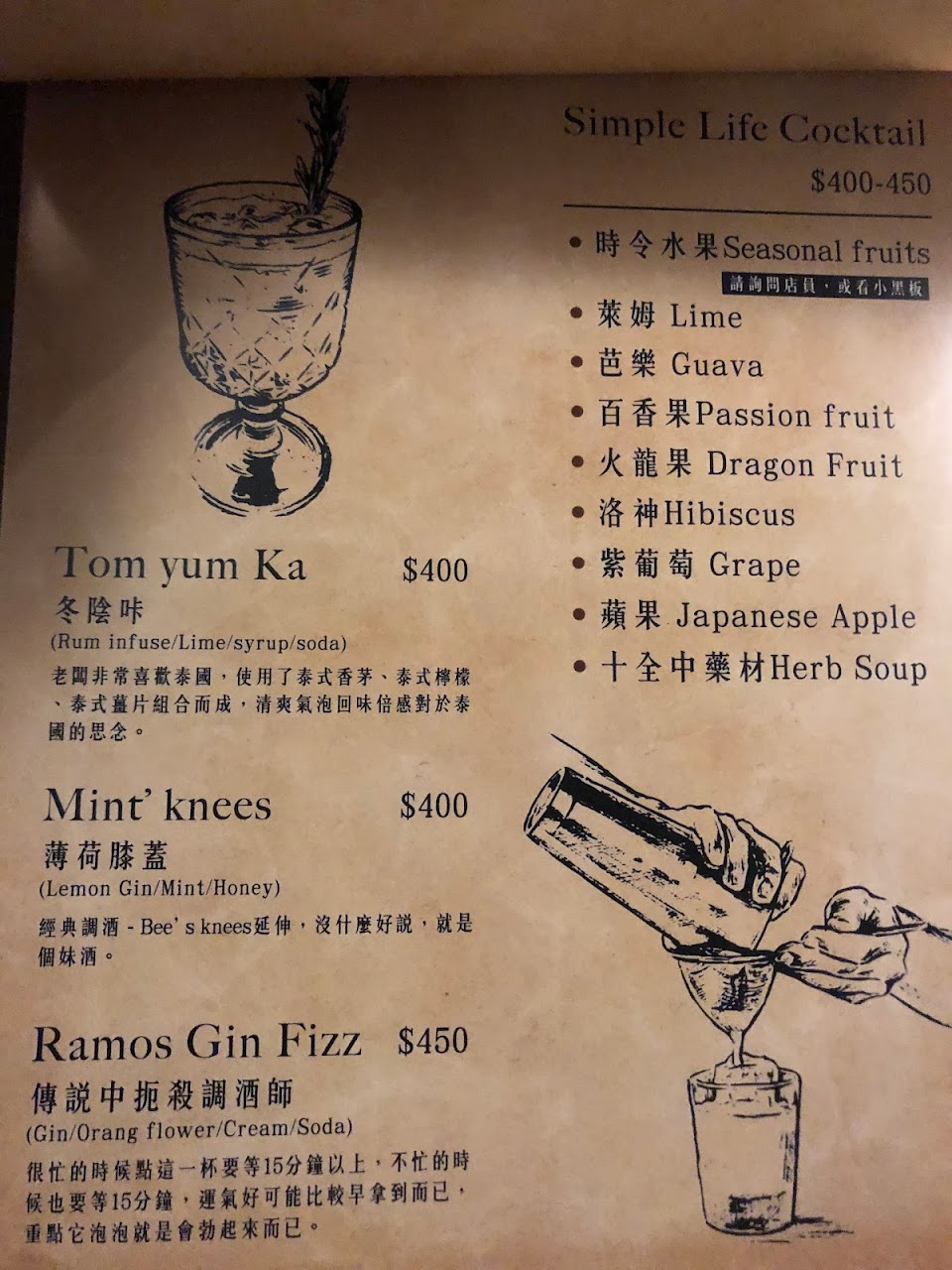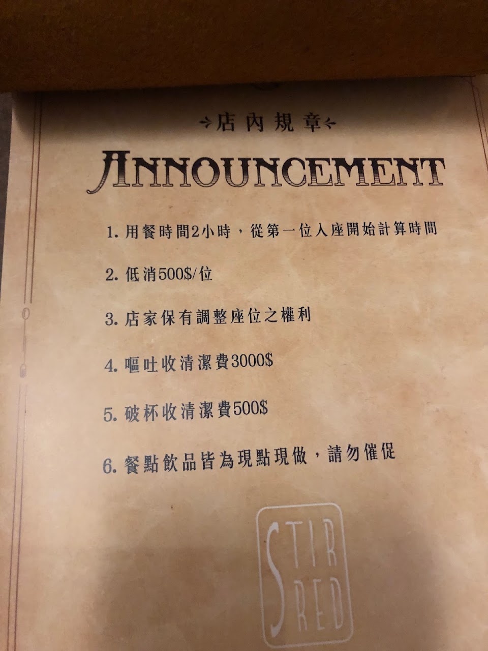 ?攪拌寓所Stirred House ??????菜單往後 前身也是酒吧,後來經過整修後菜單也有更新,詢問友人台中西區有什麼厲害的酒吧就被他推薦來這裡了。門口深夜肅靜可能是因為附近是住宅,所以要請大家喝完酒小聲一點XD? 一樓吧台有點小,二樓才有桌位跟榻榻米~基本上小堂果是比較喜歡吧台式的酒吧就是了~ ? 萊姆380 芭樂380 Asahi 200 就是薯條 小 150 均收取10%服務費 兩種水果酒系列的酒感都不會太重(不過小堂果喝完還是臉紅紅==基本是有點妹酒,我是蠻喜歡的!!!下次會想試試看火龍果口味看起來很厲害(看到隔壁桌點的 他們家薯條份量不大,不過是好吃的薯條跟芥末醬!推推~這樣感覺其他餐點的品質應該也是不錯的,算吃得巧的酒吧? ?