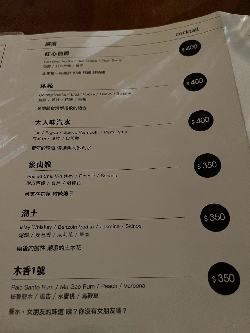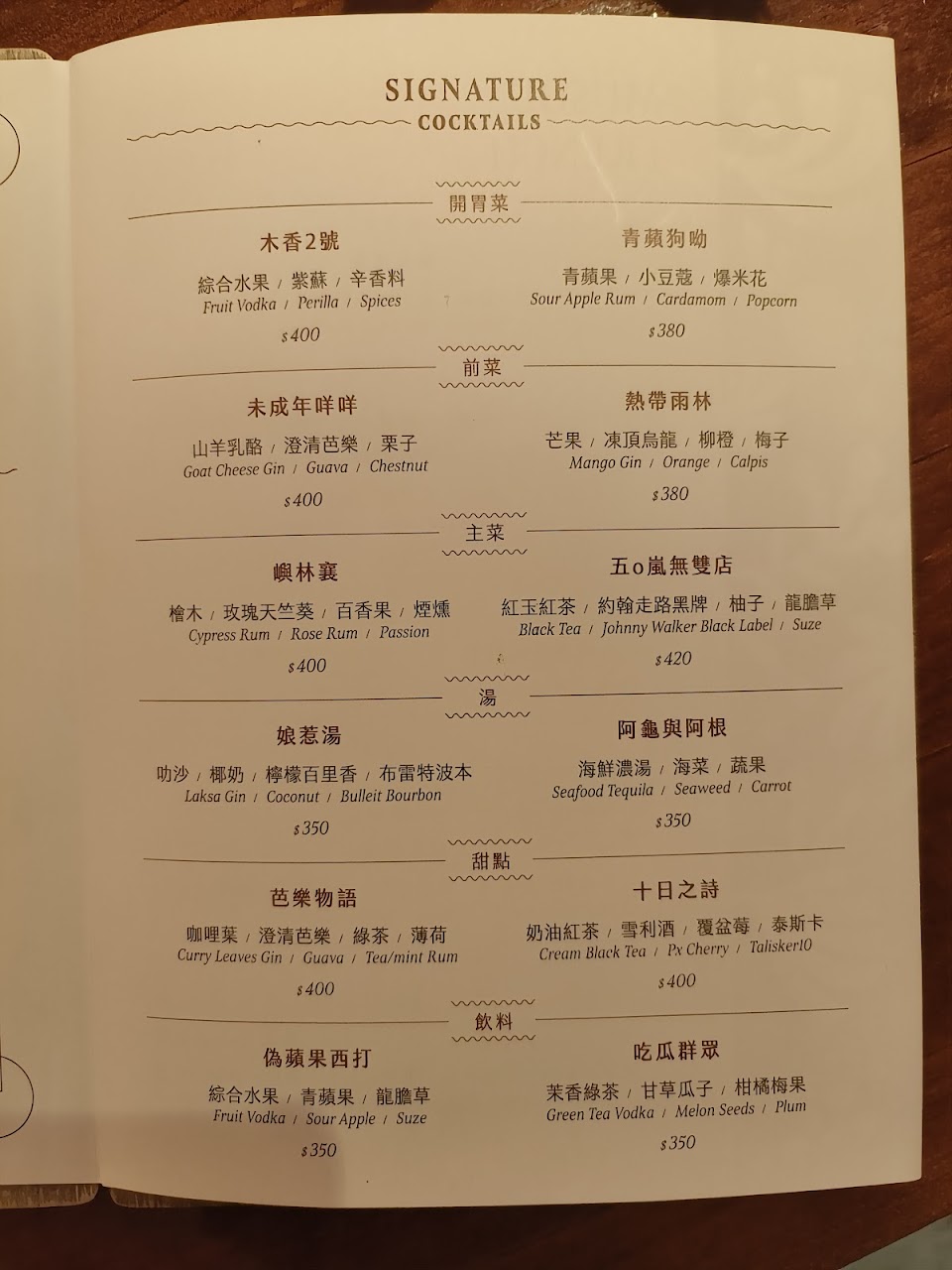酒:酒單設計很有趣,採用的是法餐的前菜、沙拉、湯、主菜、甜點的概念。平常喜歡木質調味道的人建議一定要點嶼林襄,在上桌前會燒一塊木頭放進酒裡,使其充滿煙燻味。經典調酒也非常不錯,當天點的盤尼西林也沒有讓我失望。