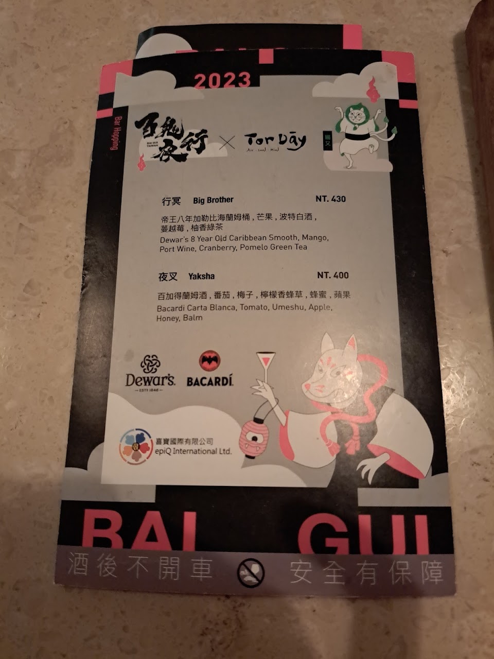 到訪日期為8/E下著豪大雨,當日有預約並且被安排坐在吧檯前座位,與一位同行友人特地慶生來小酌,因為店家還有參與晚安美之城有特殊餐點的可愛的活動所以選擇了Tor Dāy!