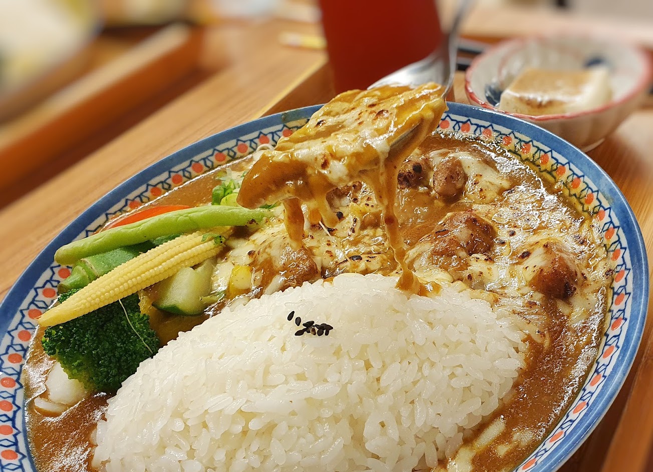 這款我加了香濃燒起司,和許多咖哩店不一樣的地方是它們的起司不是起司片!!(萬歲?)會拉絲的莫札瑞拉起司讓咖哩有了濃郁的香氣