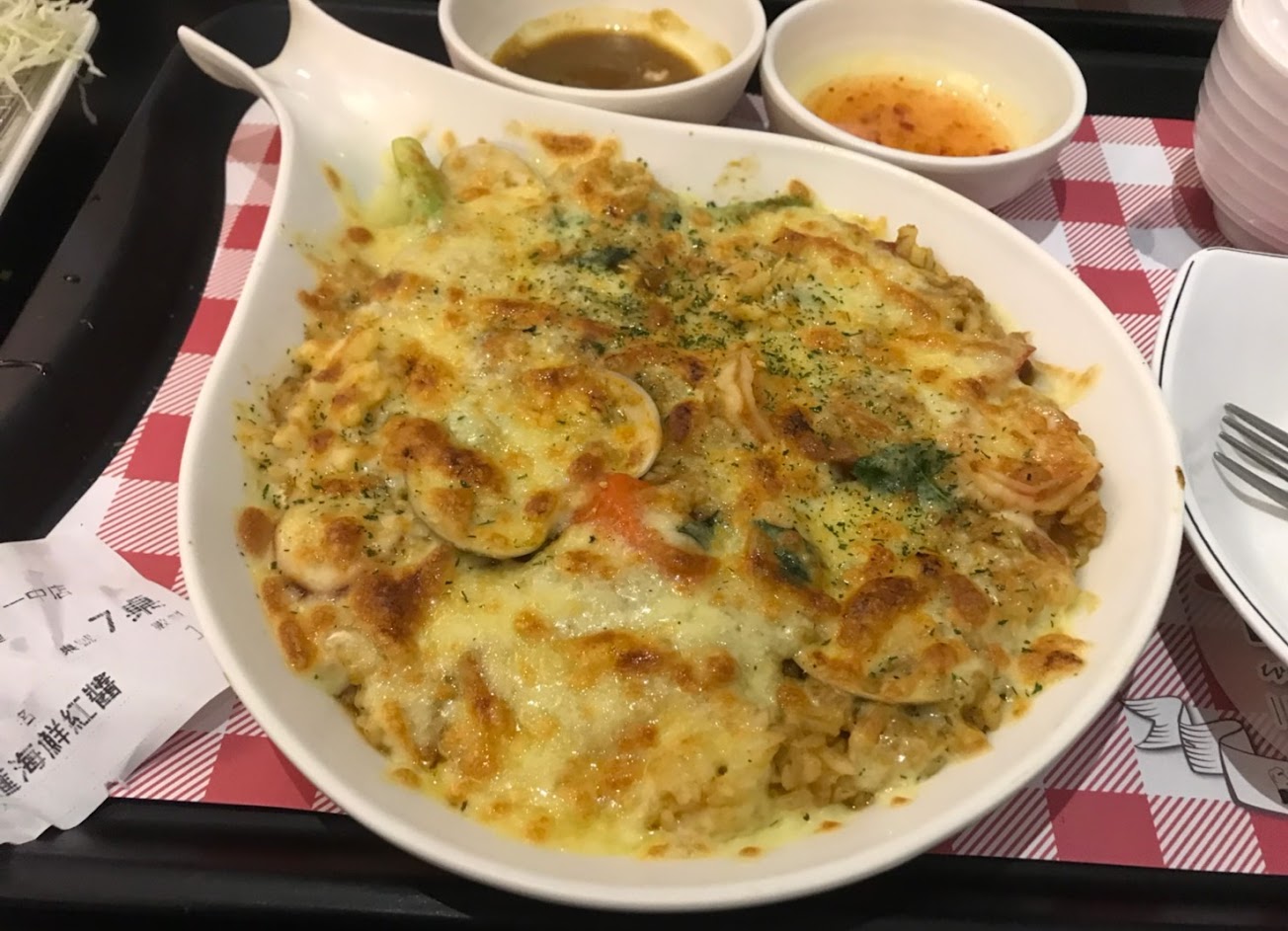 焗烤總匯海鮮紅醬,蝦子大隻好吃,米飯稍嫌偏軟爛。