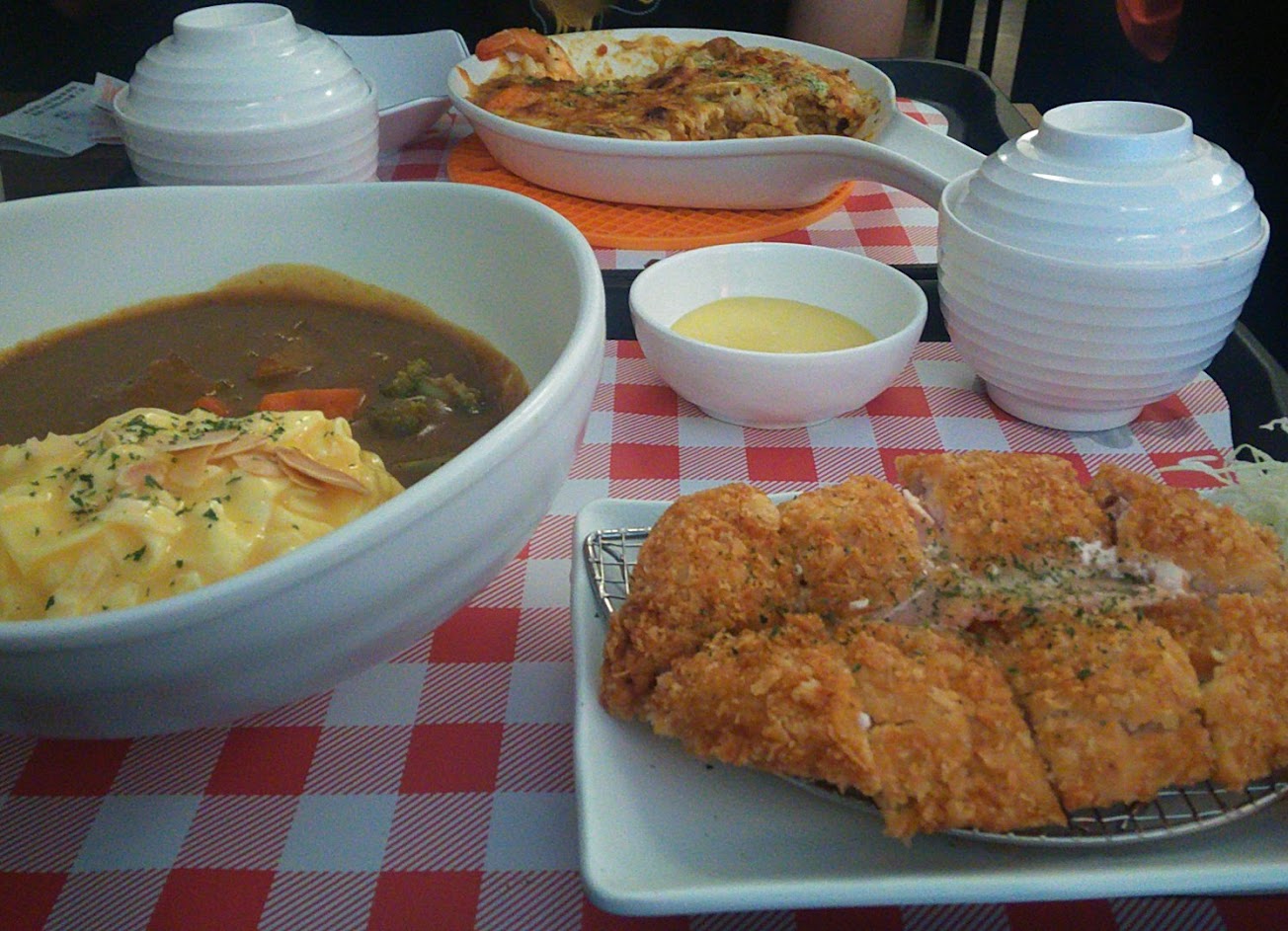 藍帶炸豬排咖哩飯,豬排稍微硬了點,但保有甜味,還不錯! 焗烤總匯海鮮紅醬,蝦子大隻好吃,米飯稍嫌偏軟爛。