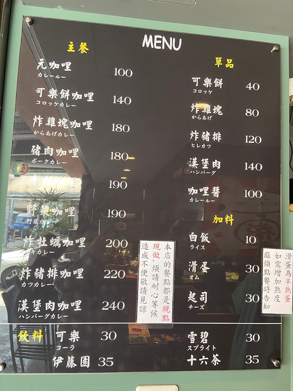 炸牡蠣咖哩, 牛五花咖哩, 炸豬排咖哩, 可樂餅 炸生蠔, 唐揚雞咖哩, 滑蛋牛肉咖喱, 牛肉咖哩加滑蛋, 炸雞塊, 滑蛋加咖哩, 漢堡肉咖哩 滑蛋 起司, 元咖哩