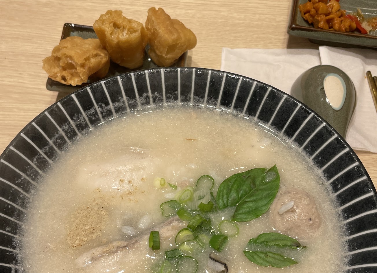 明亮的裝潢,蘿蔔、芹菜、油條、紅茶都可以無限取用;唯獨粥品雖然湯頭有別於一般市面廣東粥,有股堅果還是花生的濃郁香氣,但料真的不多,130元的麻油雞粥都是零星雞的碎肉跟小雞皮,干貝粥也是小的干貝,如果能改善,cp值才能大大提升。