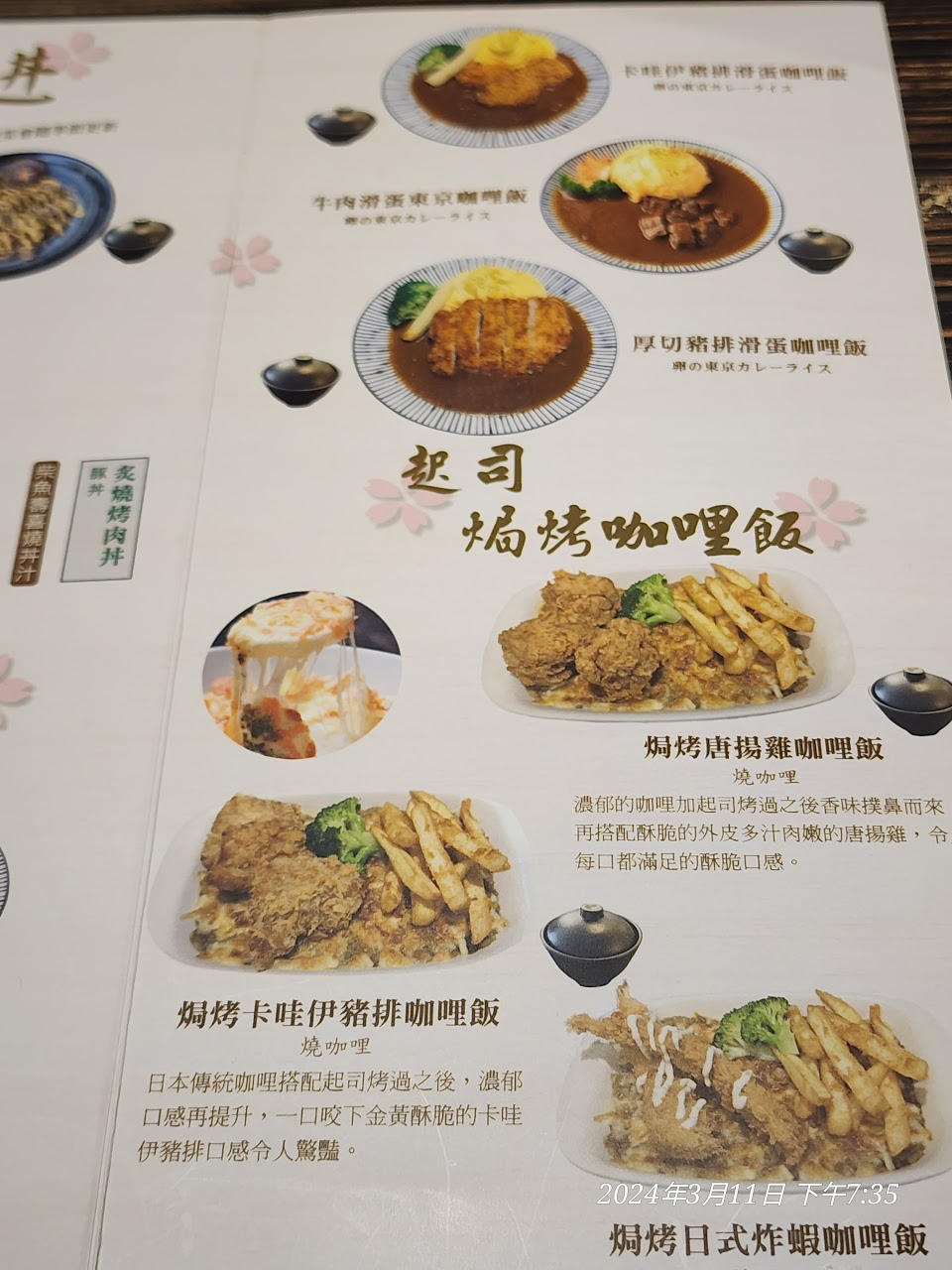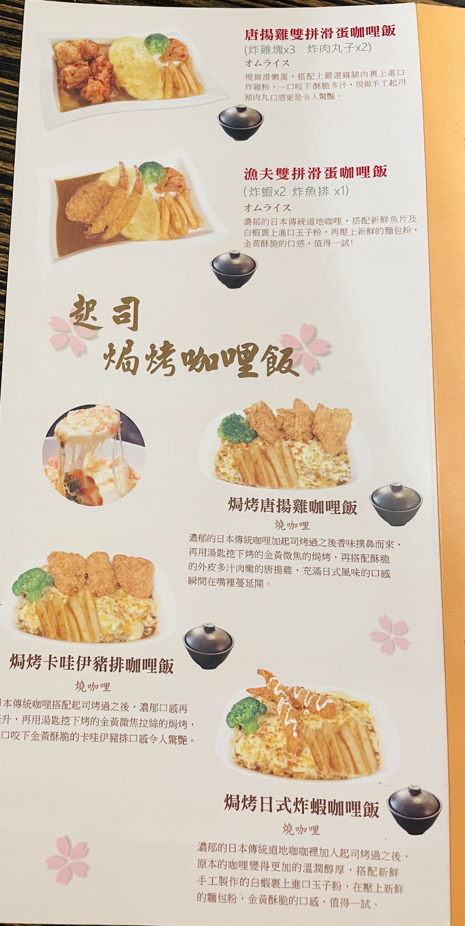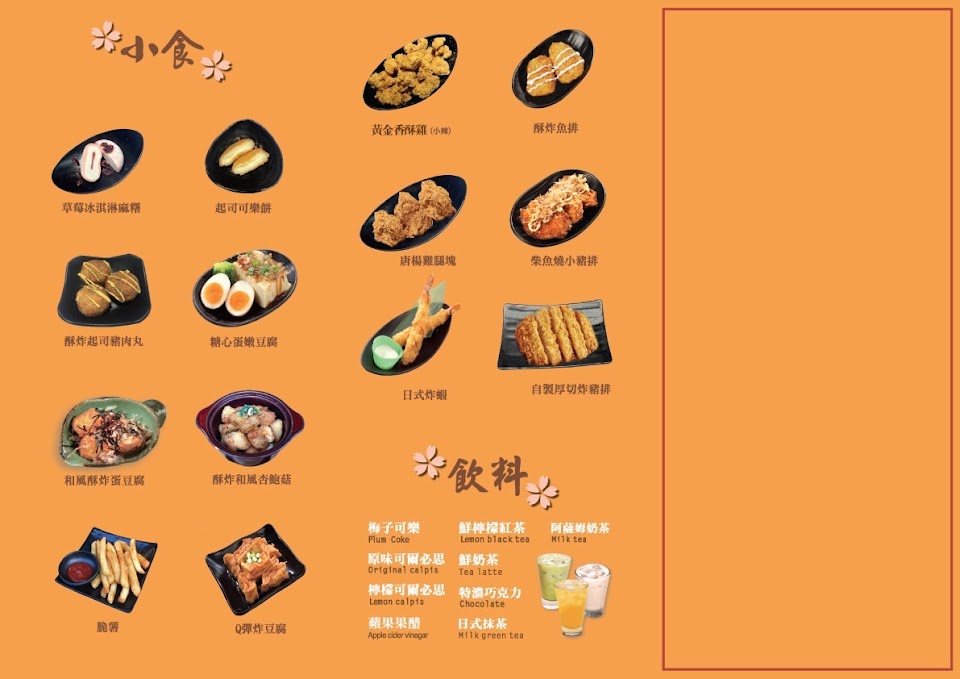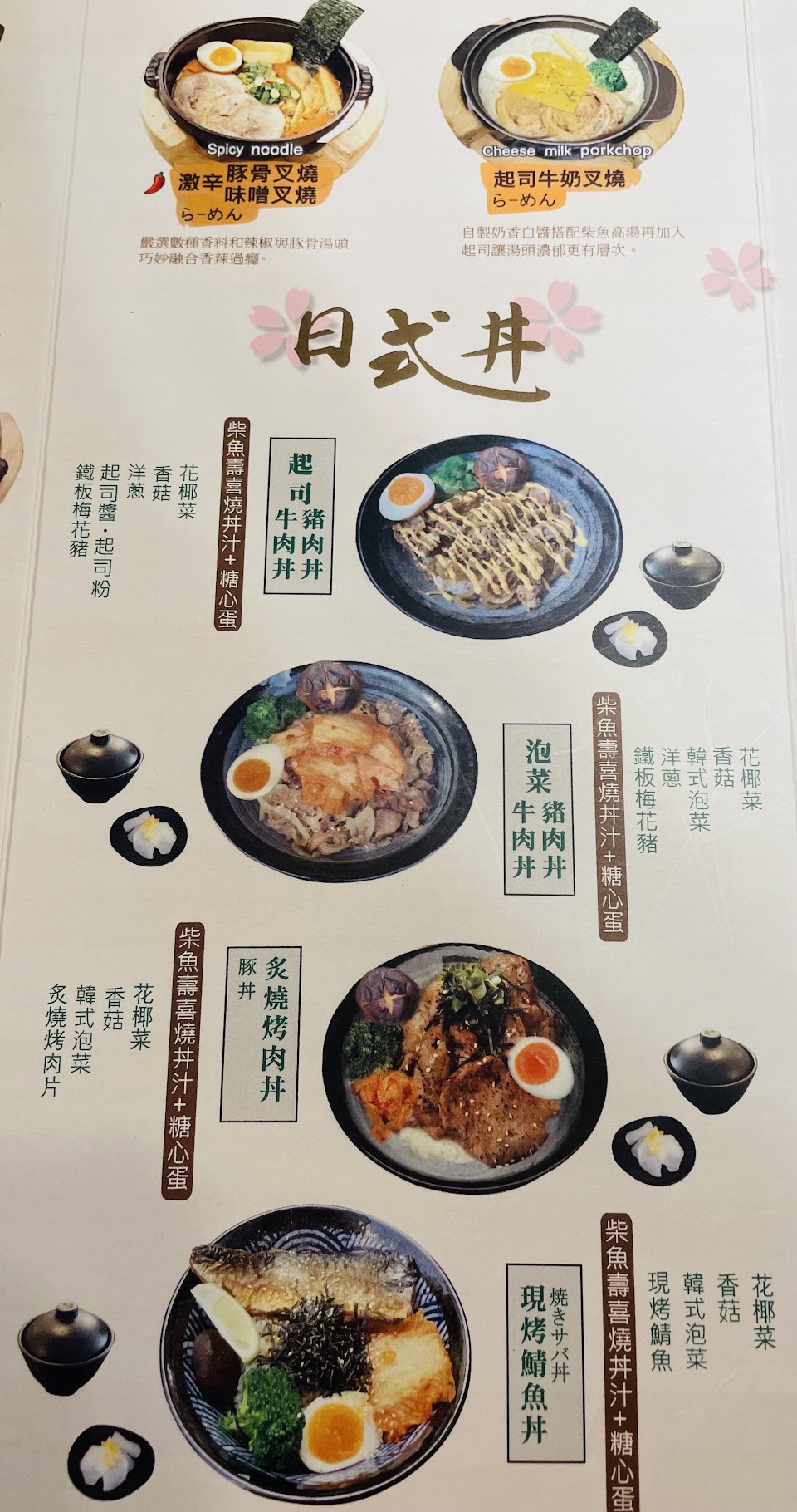 蒜香豚骨拉麵, 厚切豬排咖哩飯, 炸豆腐, 唐揚雞雙拼滑蛋咖哩, 草莓大福, 附湯, 蒜味拉麵, 札幌味噌拉麵, 泡菜牛肉丼, 焗烤卡哇伊豬排咖哩飯, 天香蒙古拉麵, 鯖魚丼, 焗烤唐揚雞咖哩飯