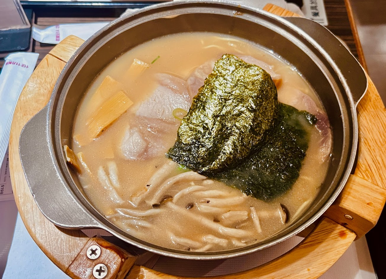 今天想說來吃個拉麵,沒想到是這種服務,是因為剛好聖誕節所以品控沒有把關好,還是一直都是這樣…;今天是12/25,上上禮拜來吃的時候一樣是點起司牛奶鍋,點餐後等了5~10分鐘餐點就來了還算快,但是因為後面的加麵偏硬,所以整體來說只能算勉強過關,今天就不一樣了,點完餐之後等了將近20分鐘,前去詢問餐點好了沒才幫我問,是不是沒有去問就一直等不到我的晚餐☺️?問完之後回到座位上,等了2分鐘左右餐點上來了,當下的反應就是為什麼我的鍋上冒的煙這麼少???下意識的去摸鍋底發現是溫的,吃了一口麵跟喝一口湯也都是偏硬跟溫的,就連兩片叉燒肉都是硬的偏冷,我想問一下拓海家的師傅,是因為什麼原因所以我的餐點會變成這樣?讓我能把餐點吃一半就不吃的店家我只能說少之又少,不會再去吃了 天氣很冷 卻沒有我的心冷?