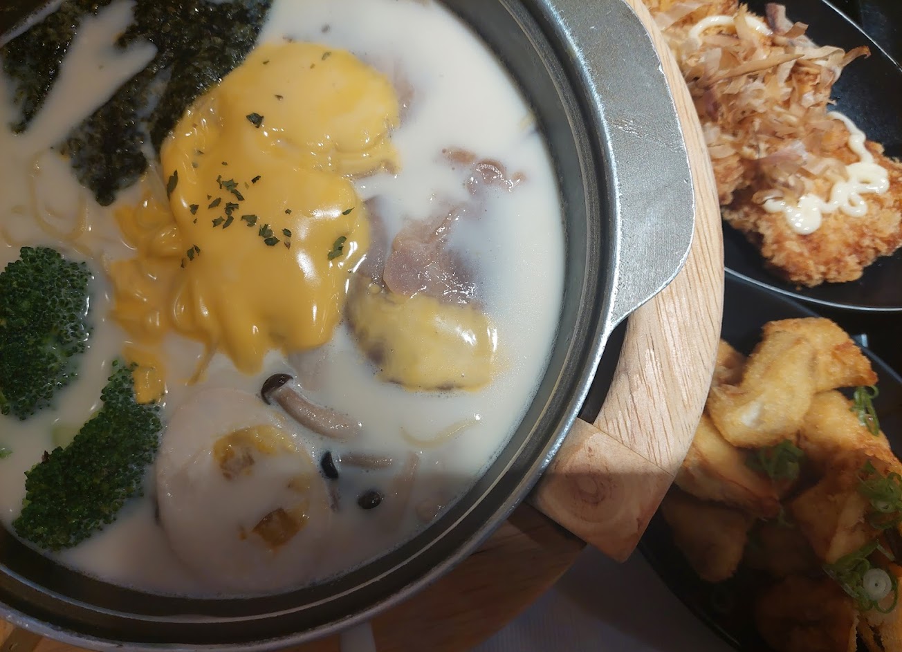 ?起司牛奶拉麵(170)奶香挺足的,也不會太膩。溏心蛋嫩豆腐,中規中矩+酥炸和風杏鮑菇(98)