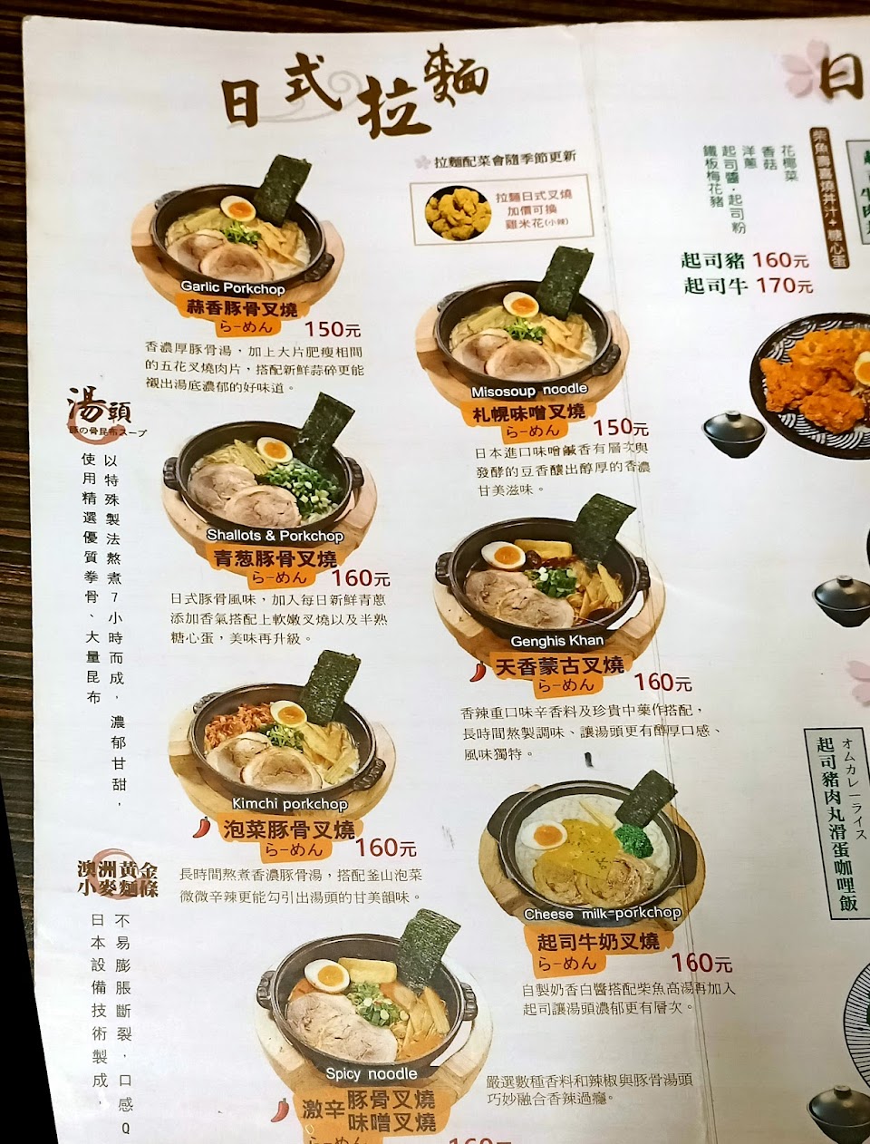 點了泡菜豚骨拉麵180元,還有唐揚炸雞丼飯,CP值普普。