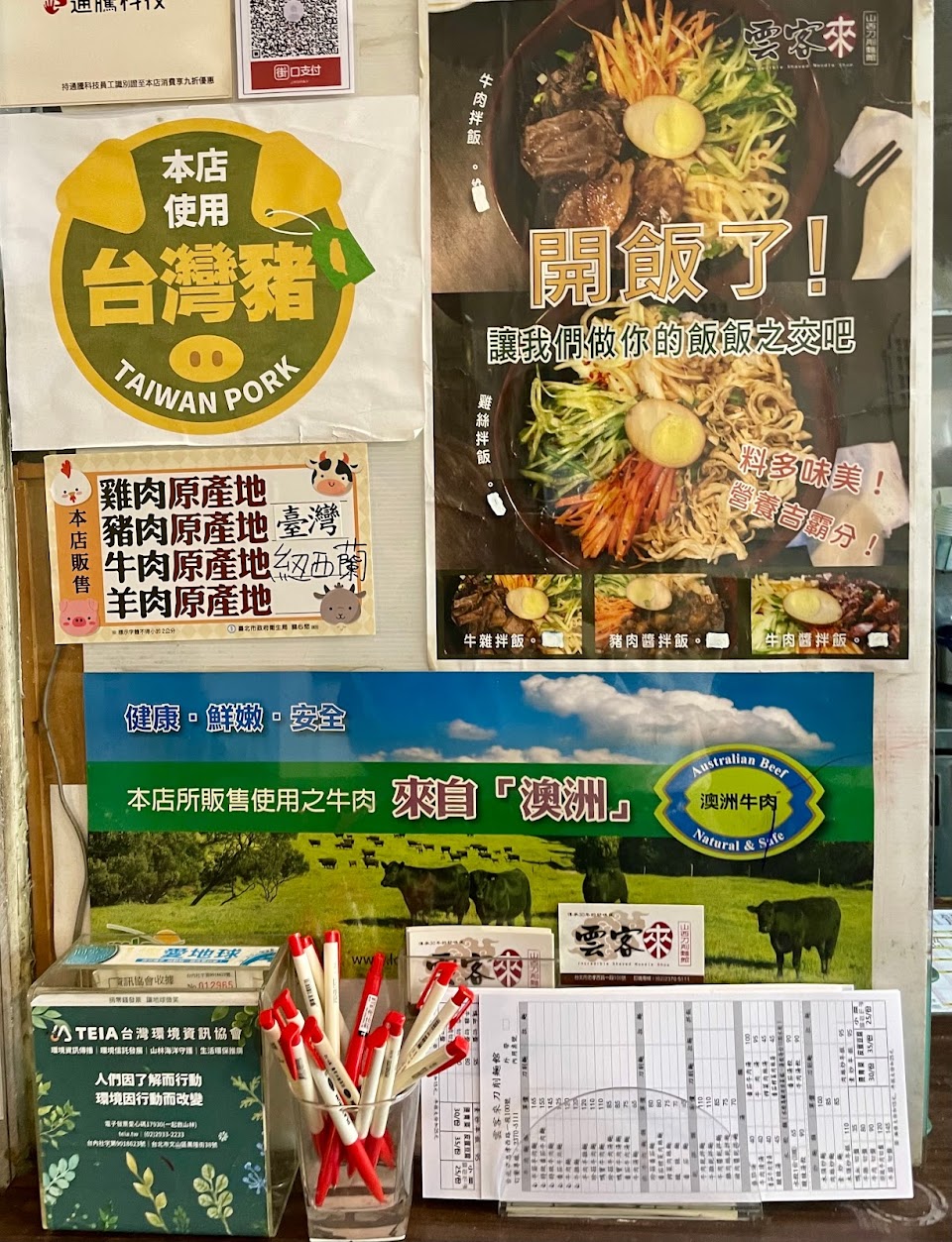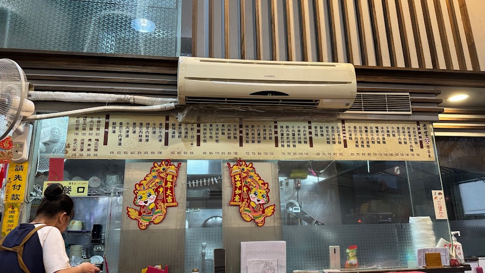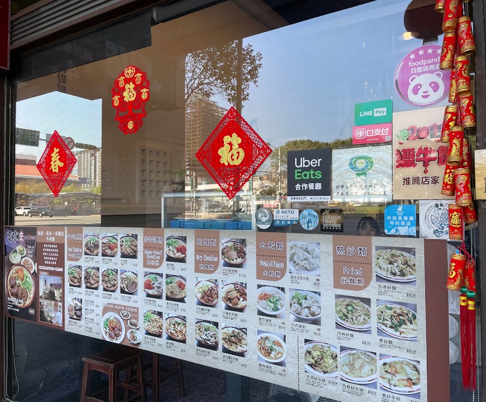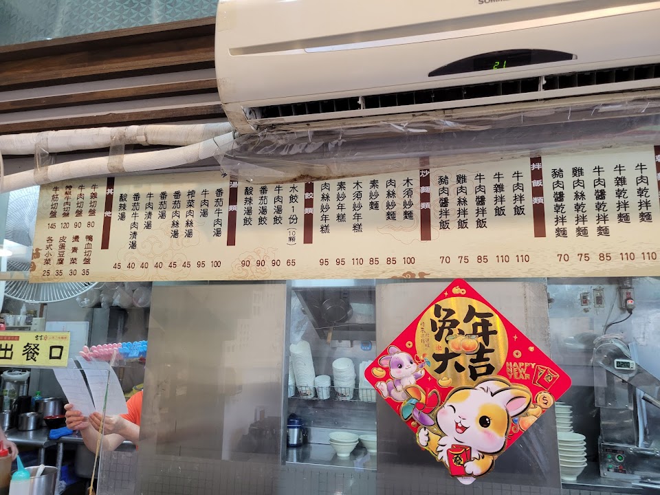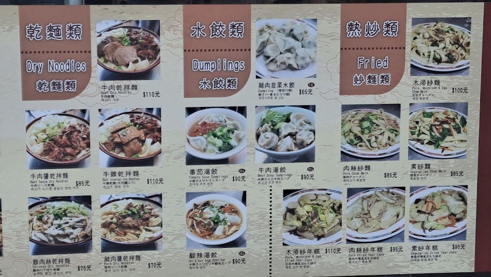 菜單包括各式湯麵、乾拌麵(飯)、湯類、水餃、炒麵及小菜。麵條有刀削麵及拉麵兩種可選,找好位置填寫菜單後先結帳。