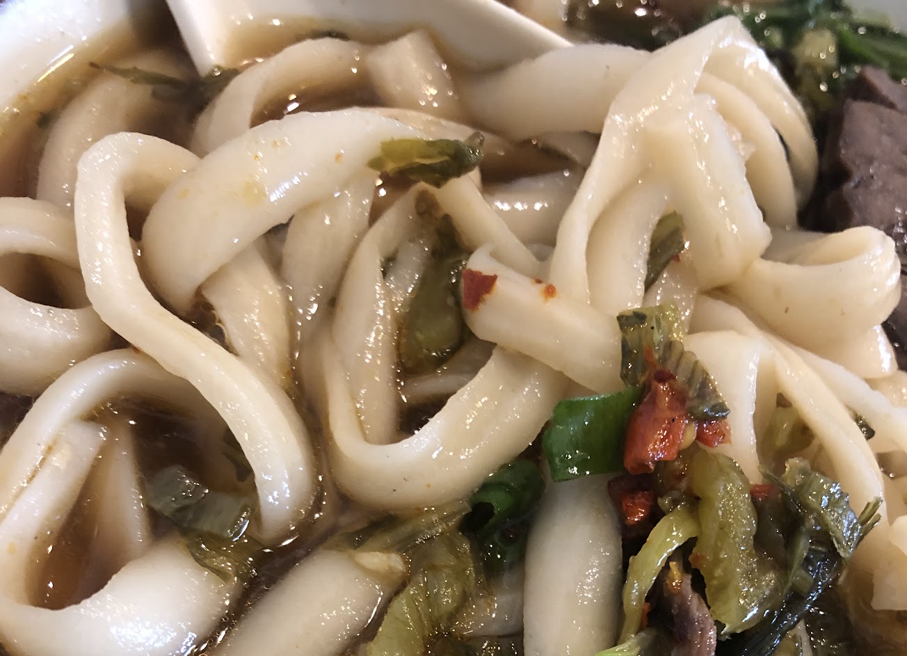 刀削麵條不會過粗和過胖,身材苗條穠纖合度,QQ的手桿麵條頗好咀嚼,可能要點的乾的木須炒麵才能強烈感受到麵條的軟Q度 肉塊頗多雖然牛肉塊非牛腱部位,但都有點厚度,又滷得肉質不乾柴