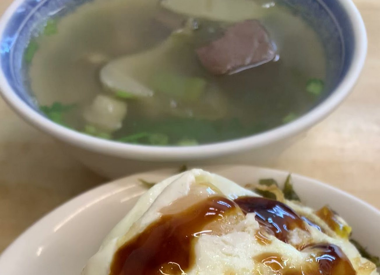 半熟蛋必點,煎得不錯,湯品也都很強,味噌湯是晚間時段供應,點了骨仔肉湯,店家將骨仔肉切成小塊,口感不錯。豬肝湯也很強,太晚來可能就賣完了。