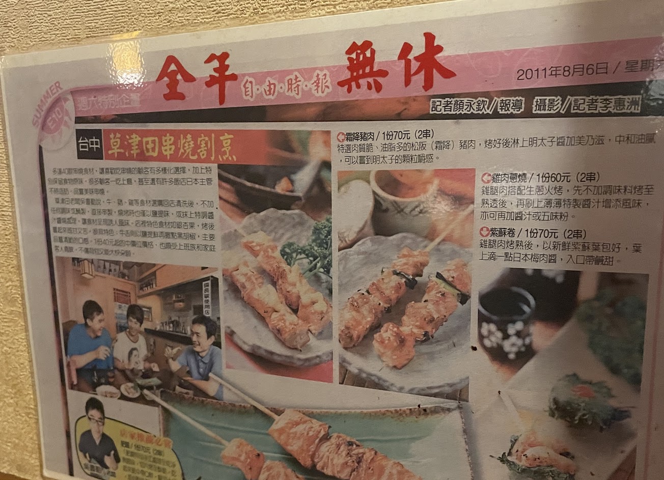 本來要吃對面的吳記肉圓,結果遇到公休日偶然踏進草津田,第一串雪花霜降豬口味驚為天人!老闆對火候的控制技巧數一數二,每一道都都令人驚艷,期待下次來訪!