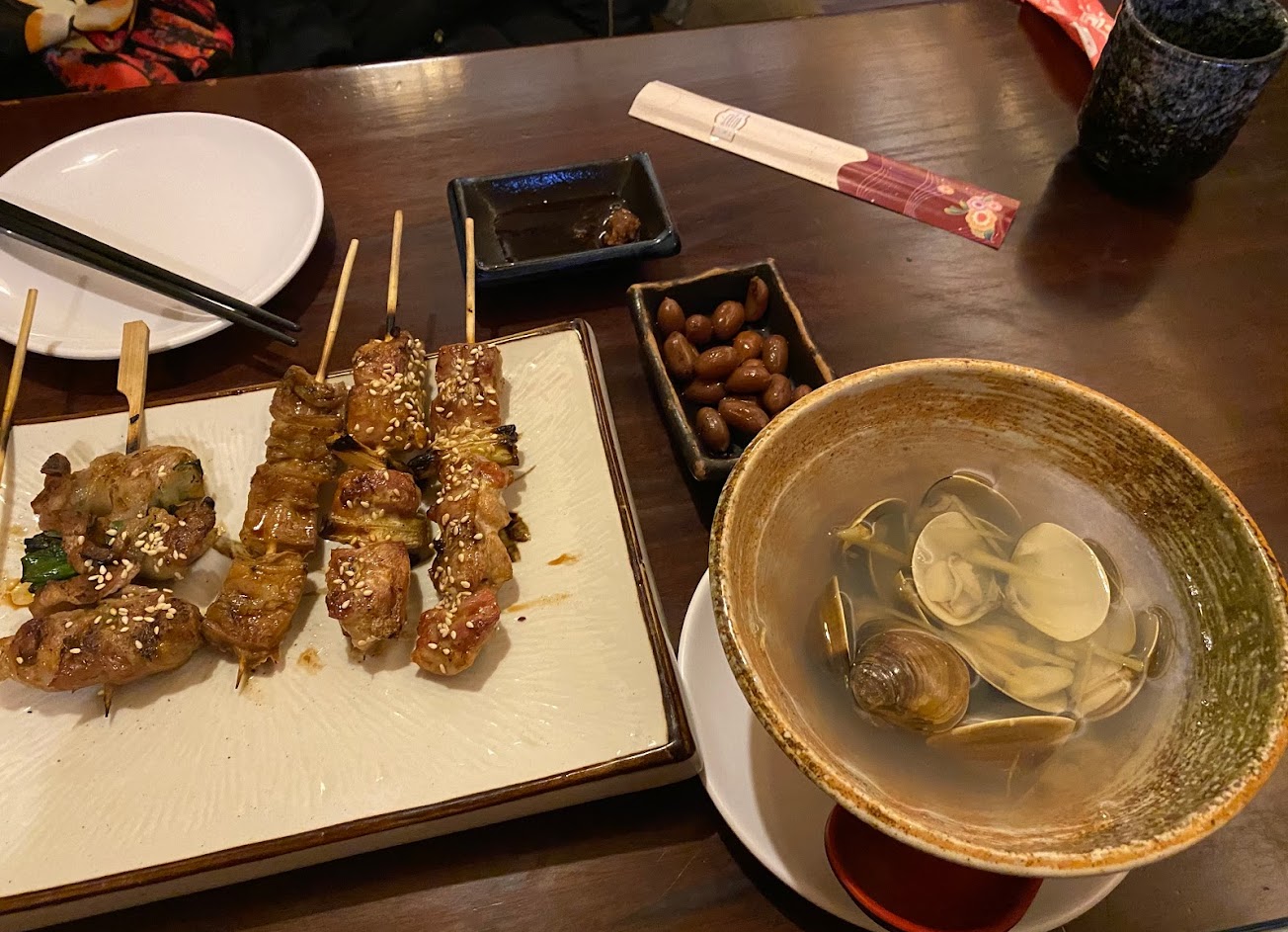 老板很親切,蛤蜊湯很鮮甜好喝,串燒老板會提醒我們趁熱吃,烤飯糰很酥脆還不錯吃?