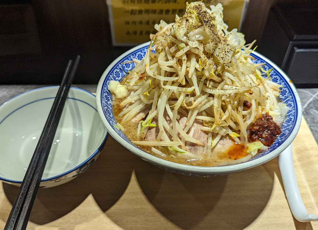 感想:這次第一次嘗試二郎特色。不愧是以分量出名,我點了最多份量的豆芽菜,結果佔滿整碗八成;同時醬油點了增量,讓我吃到後來都感到冒汗,所以沒吃過的人建議蔬菜、蒜、背脂、醬油皆慎選。