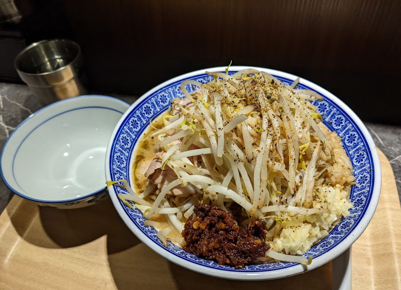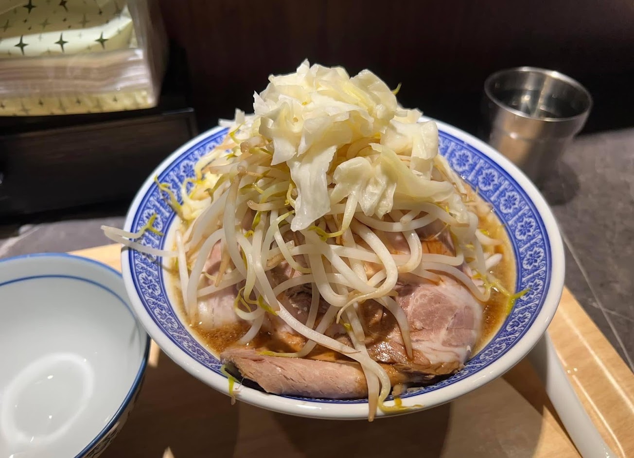 拉麵一上桌,碗上面堆滿的豆芽菜、高麗菜及蒜末,叉燒有兩大片,麵有150克。店家建議先將蔬菜放入小碗,再將麵沾滿湯汁,膩口時可搭配蔬菜一起吃。麵體是粗麵,湯頭濃郁蒜味十足,份量超多。叉燒有難咬斷,太大片了。溏心蛋有淡淡的白蘭地酒香,會被湯汁味道蓋掉。