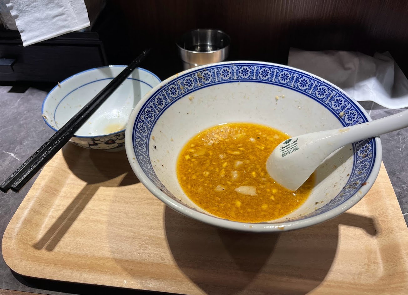 椒麻大吞山,無背脂,蒜最多,配置有點忘了。 整個就是很二郎,花椒味可以讓整體感覺不會那麼膩,一般人第一次去吃的話建議先不加背脂,湯裡本身就有油脂,加背脂吃到後面可能會太膩,蒜的話也可以選最少量就好。這樣的配置對我個人來說是比較剛好,但追求重口味的就加好加滿吧!