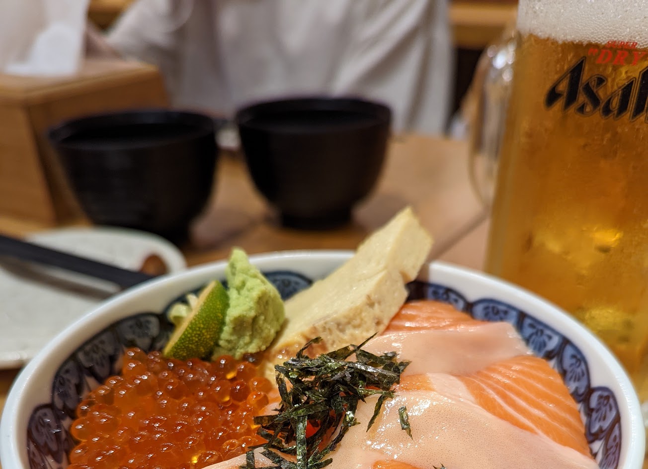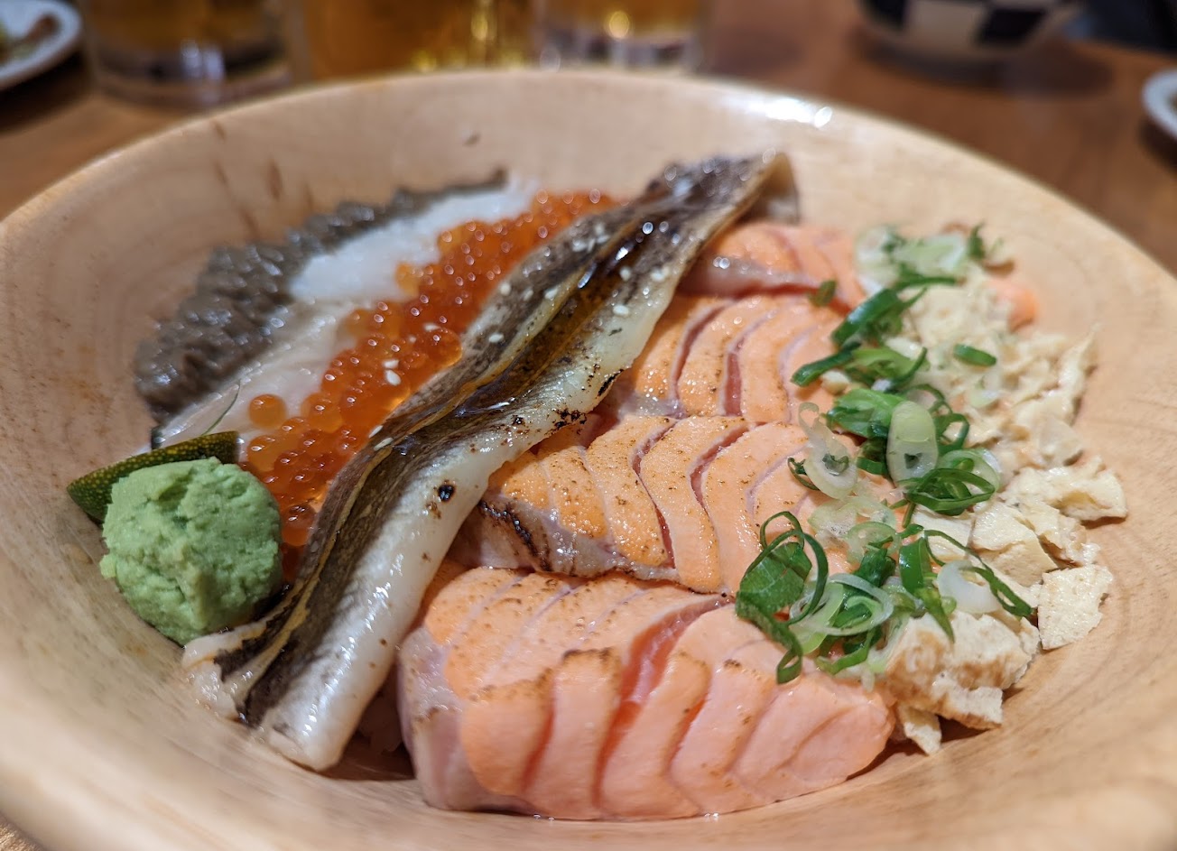 生丼用料新鮮、鮭魚沒有腥臭味,油脂豐富、入口即化。米心偏硬,飯量算恰到好處,配著魚卵或蟹膏扒上一口鹹甜適中。炸物表現也是可圈可點,薄脆的麵衣包裹著多汁 Q 彈的雞腿肉、鮮味十足的牡蠣、和軟嫩清甜的蛋豆腐,一口炸物一口啤酒相當罪惡 ?? 唯一可惜的是炸麻糬不如燒烤的做法,容易吃油、口感黏糊,吃起來小有負擔不適合當成一餐收尾