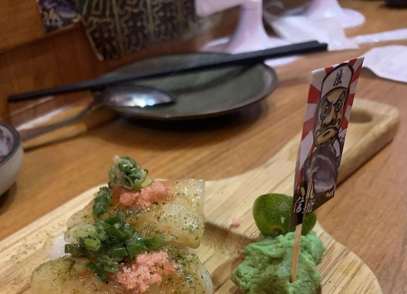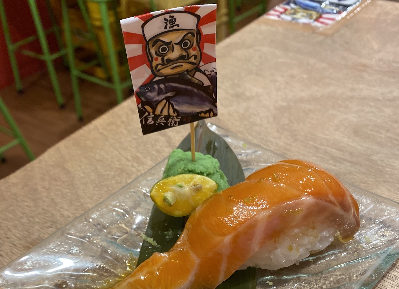 廁所貼滿漫畫滿特別的,應該是打卡贈送的炙燒旗魚握壽司所以評論滿高的,但味道普通,看很多人都沒吃完。