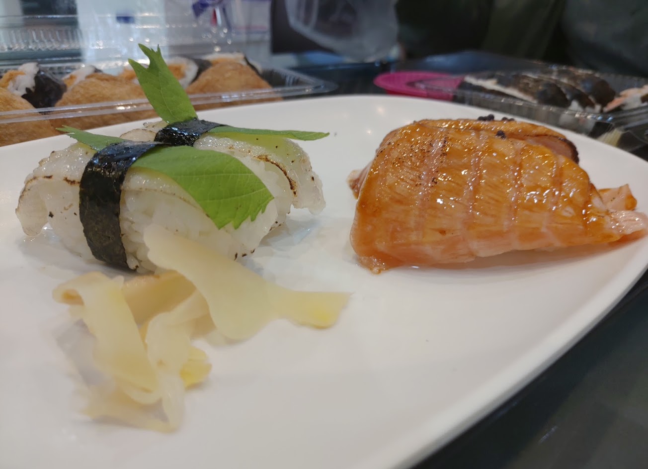 炙燒鮭魚壽司 2顆 80元,魚肉厚,炙燒也恰到好處。