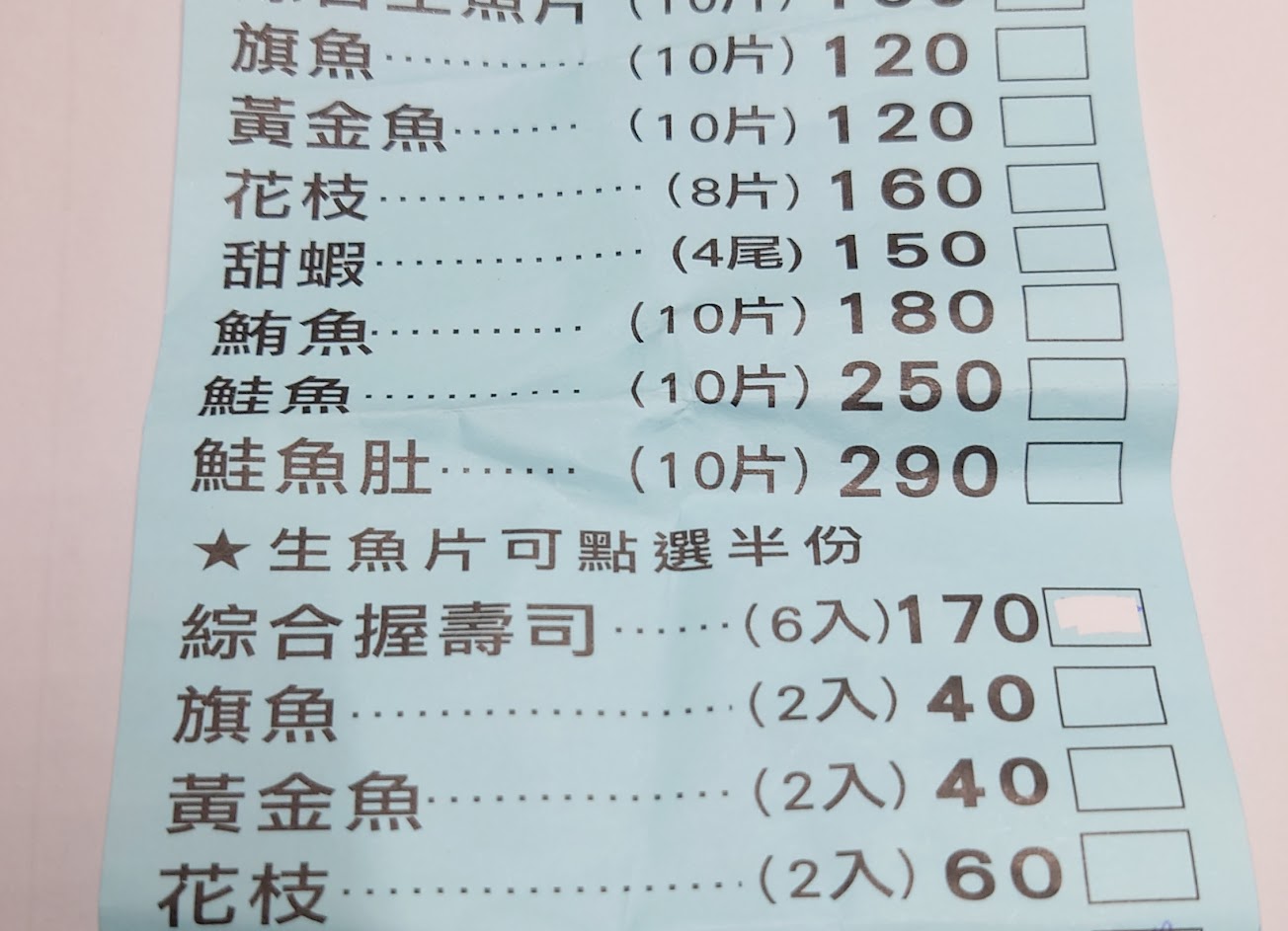 外面會有一個伯伯管理人潮,算是走CP值路線的壽司,不知道是不是運氣好還是怎樣,旗魚切得滿大塊的,然後黃金魚有加檸檬味,稍微迸出新滋味,這家壽司還可行。