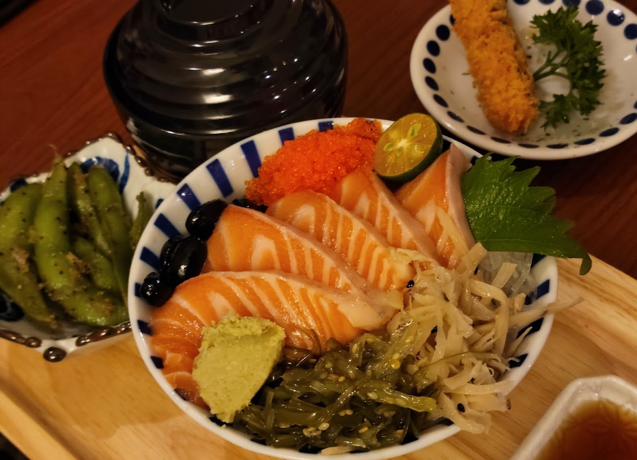鮭魚丼飯比想像優,雞唐揚爆山丼肉塊份量多,裝潢走日式結合台式舊建築無違和感。