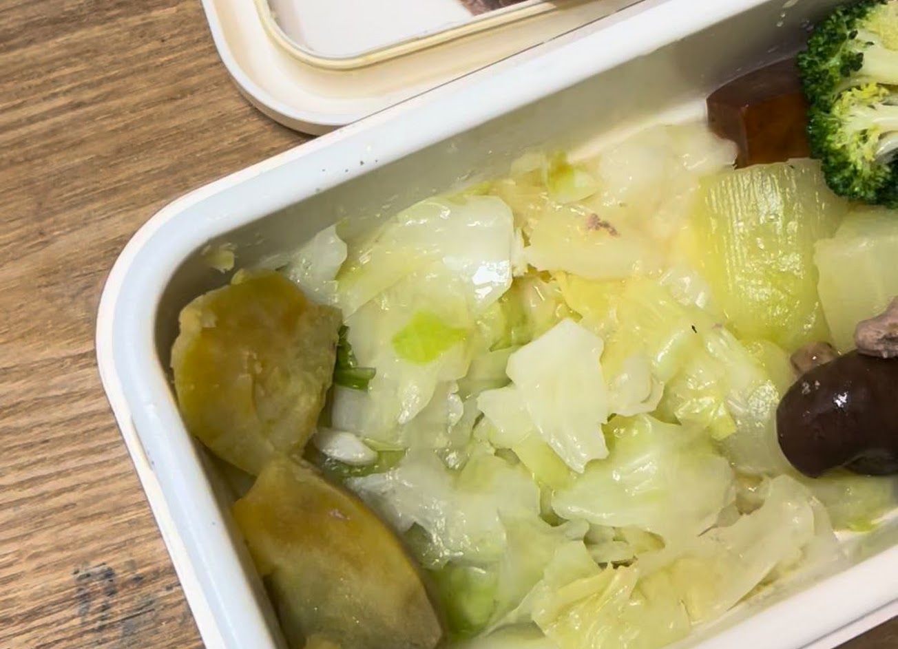 菜色豐富,高麗菜好吃有甜,醃蘿蔔脆,甜還帶有柚香,照燒雞腿很嫩,地瓜很鬆軟,好吃。