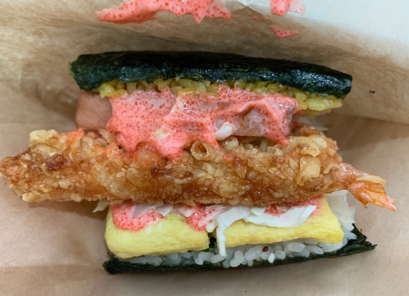 天婦羅炸蝦歐姆蛋巨無霸:炸蝦與明太子醬的搭配很完美,可是只有一隻,沒有分配好一口氣吃完後,後面的飯糰會讓人感覺有點空虛,醬料會比較偏鹹。好吃但是可以再考慮一下才會回購的口味。