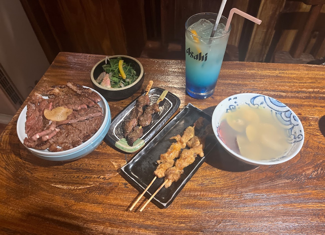 日式風格,點牛排丼+烤餅+肉串+明太子山藥,最後再來一杯好喝又不貴的特調~有夠享受!