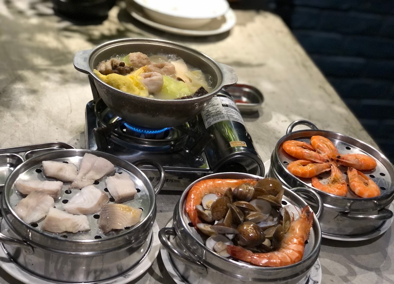 層層堆疊的「蒸煮鍋套餐」底層的小火鍋的湯頭是使用燉煮8小時以上無任何調味的清骨湯,再分別放入季節蔬菜、白蝦、蛤蠣及多種火鍋配料,上層分別是蛤蠣、鯛魚片、白蝦及大草蝦,蒸滾後海鮮的鮮甜味都會順著流進小火鍋內,讓湯頭喝起來更加地鮮甜?
