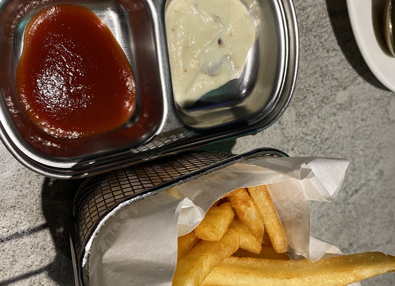 送餐點也是一杯飲料、一小份薯條這樣分開上,搭配薯條的醬料也是吃完了才上。