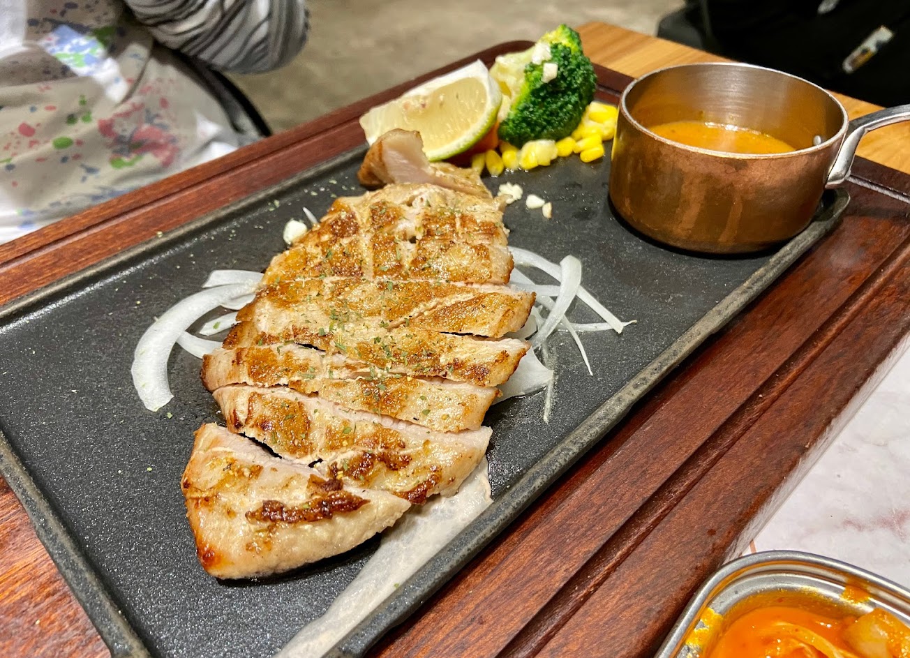 牛排很嫩,肉質不柴,雞腿排也是非場軟嫩焦香,兩者皆附蒜片、泡菜醃蘿蔔、花椰菜,我比較不愛沾醬所以後來直接沾玫瑰鹽,好吃。