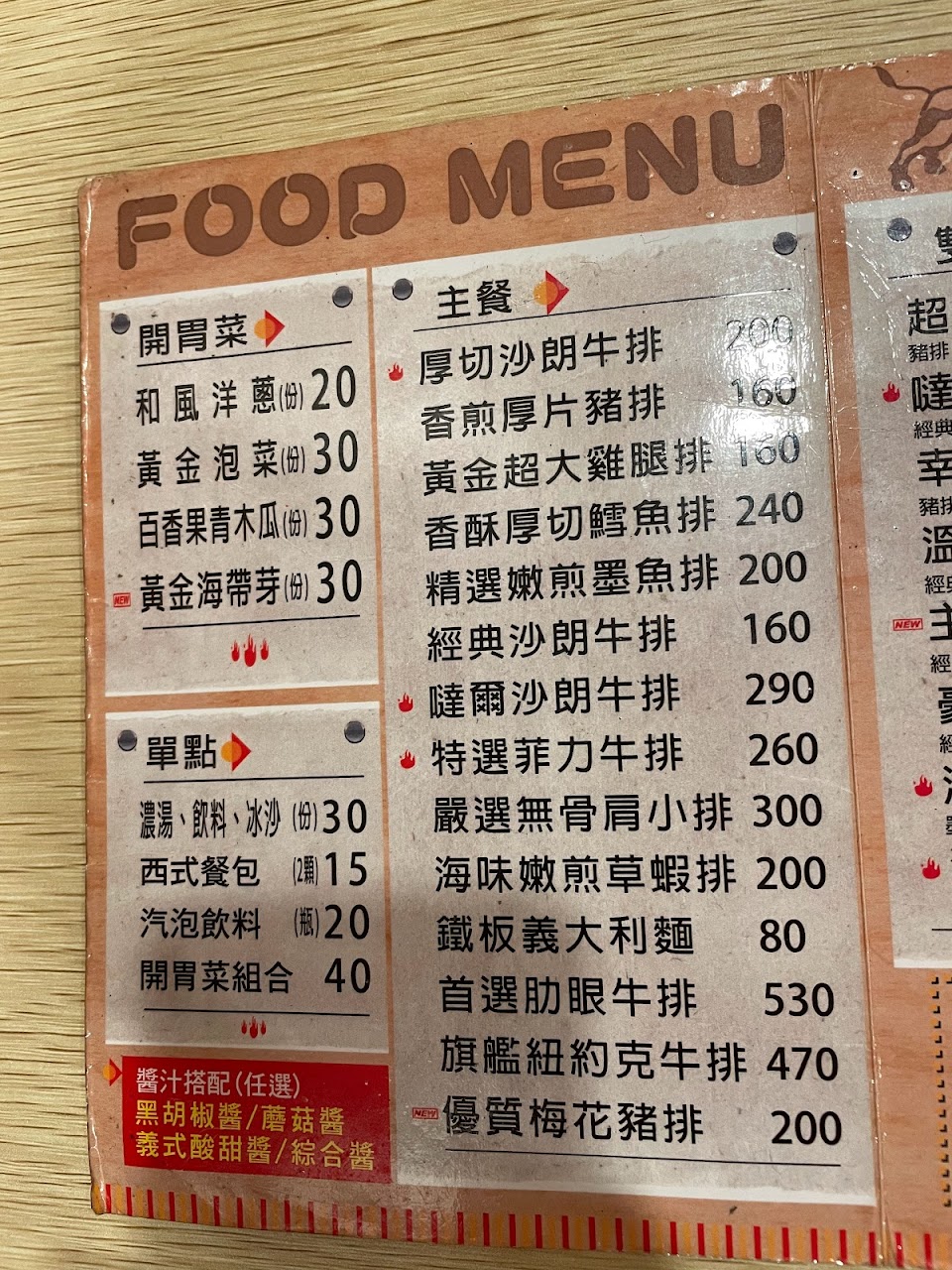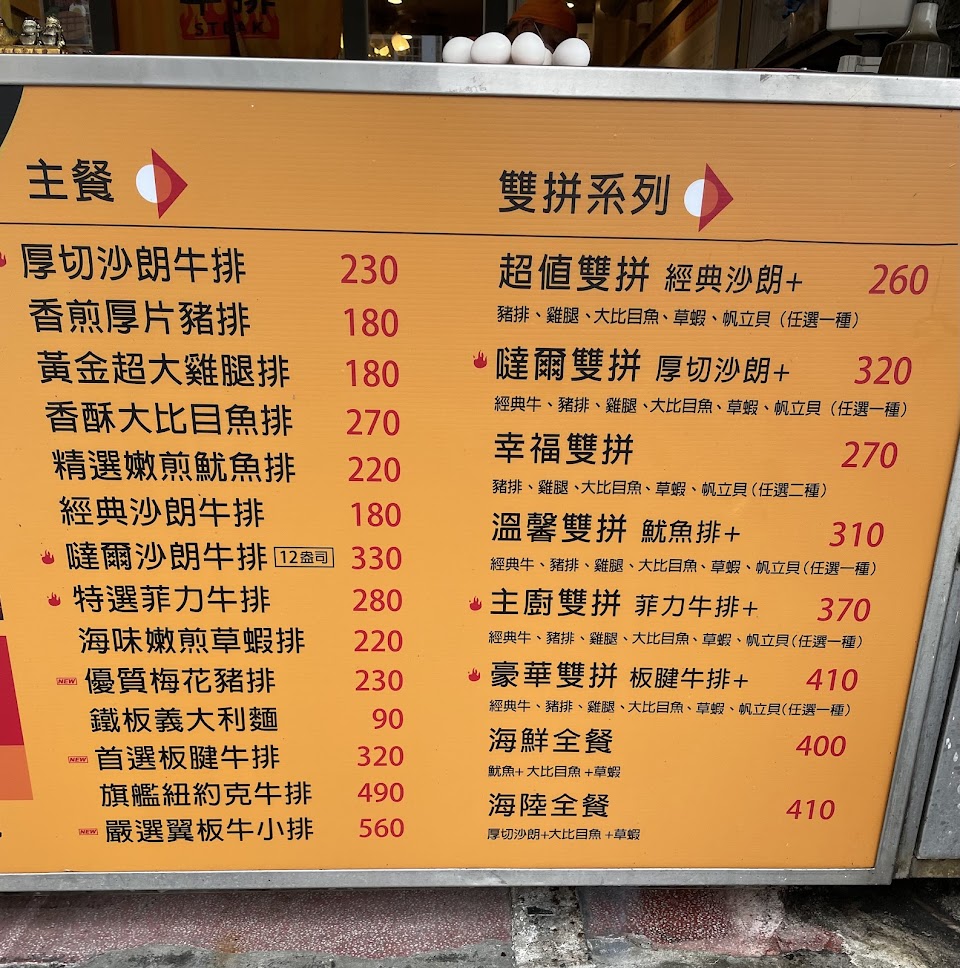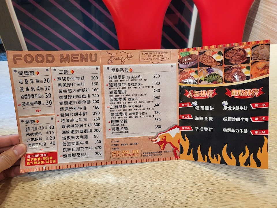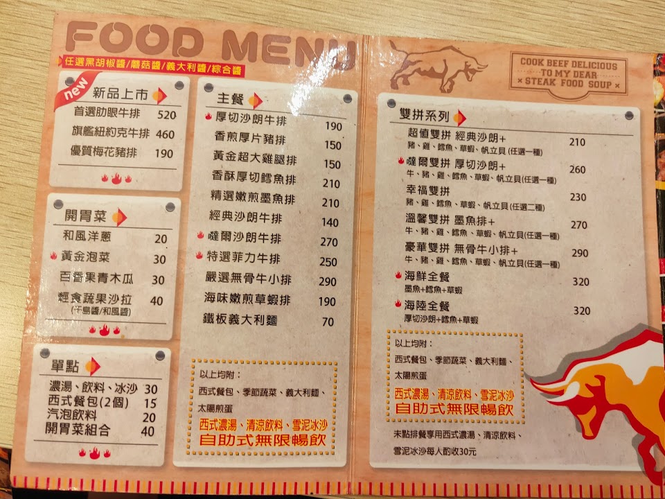 厚切沙朗牛排 雞腿排, 免費續鐵板麵, 玉米濃湯, 免費牛筋湯, 香煎厚片豬排, 幸福雙拼梅花豬肉排, 爆漿餐包
