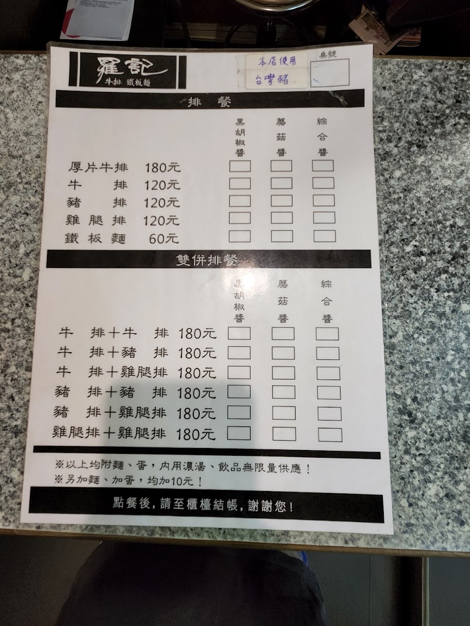 雙併190元很可以?不要麵可以換蛋,不要醬也不會太油,有麵的麵也多^ ^而且肉質好吃又新鮮,用餐環境乾淨衞生,服務人員在裝瓶辣醬都會在清潔瓶口,厠所也很乾淨去廁所時?了一下廚房發現這家店真的很實在因為廚房也是很乾淨真的裏裏外外都讓人覺得吃得很安心,服務品質???真的是棒!