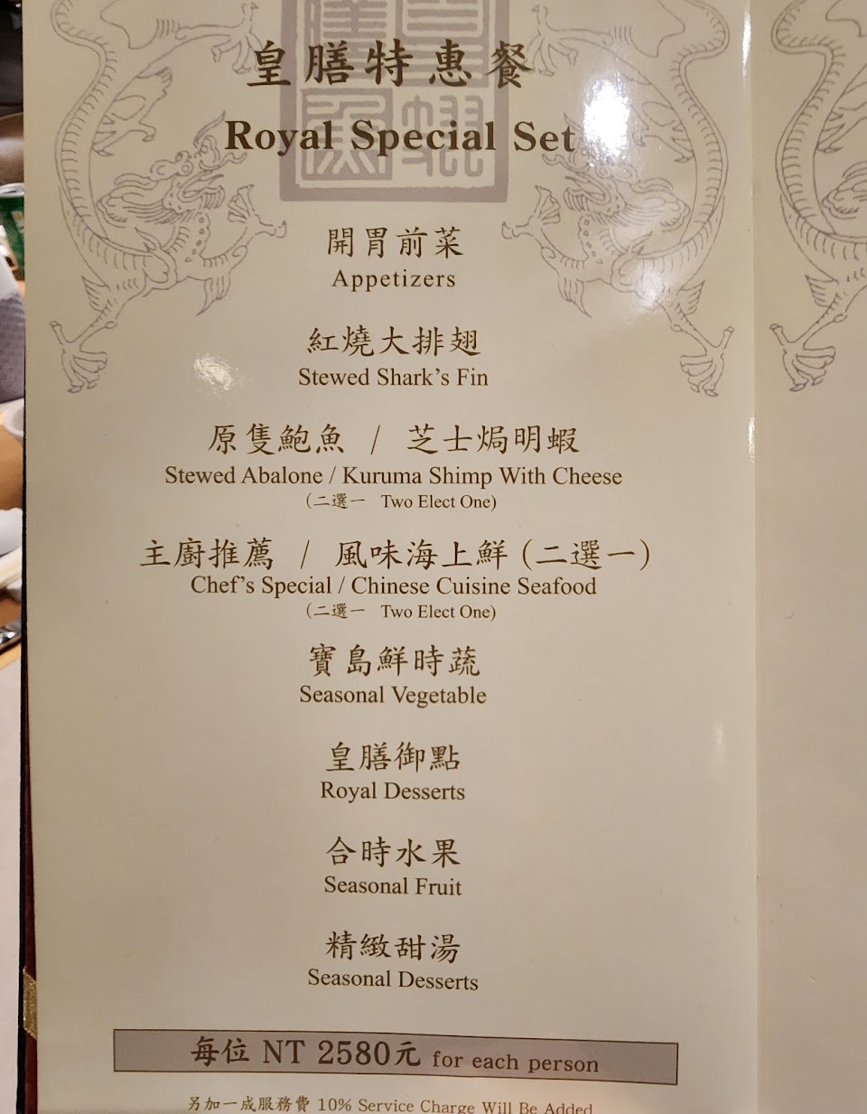 高檔的料理,大片的魚翅,厚度很夠,味道很好!鮑魚好吃彈牙,味道重了點。牛排很嫩!菠菜干貝絲可,燕窩甜湯燕窩量十足,水果好吃,綠豆糕一般。主菜和配菜都很不錯。服務態度很好,但全部吃完後覺得不夠滿足…..需要再吃些什麼! 服務 內用 餐點類型 晚餐 平均每人消費金額 超過 $2,000 餐點:4 服務:5 氣氛:4