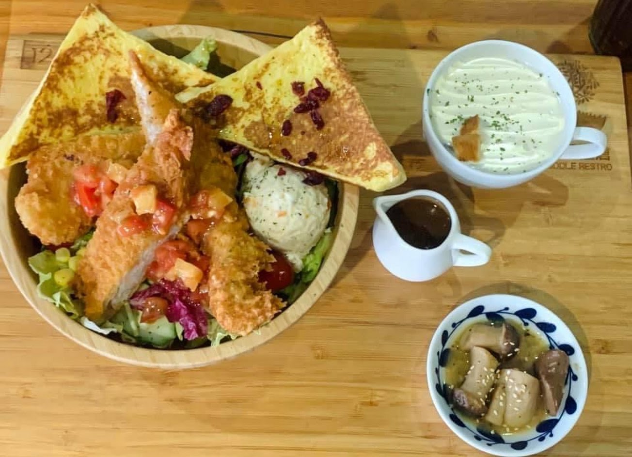 上方的魚炸的酥酥脆脆、搭配沙拉?比較不膩口