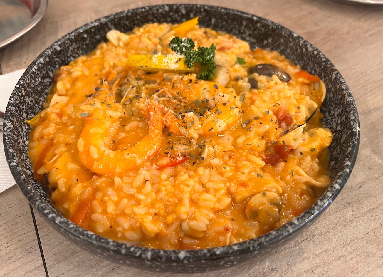 後來吃了我的巴黎香榭麵,第一口的味道沒有之前吃過的這麼驚豔,然後麵偏硬了一點,醬也沒有到很包覆麵條,吃起來滿乾的,後來和人員反應了,是否能再給我醬淋,店員表示整盤要直接再回鍋做