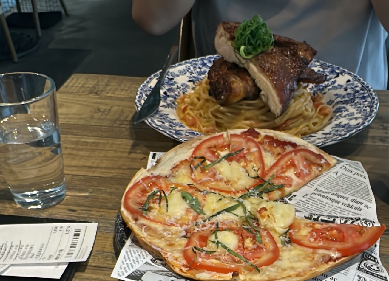 吃了雞腿排橘醬義大利麵、青花椒唐揚雞和芒果提拉米蘇