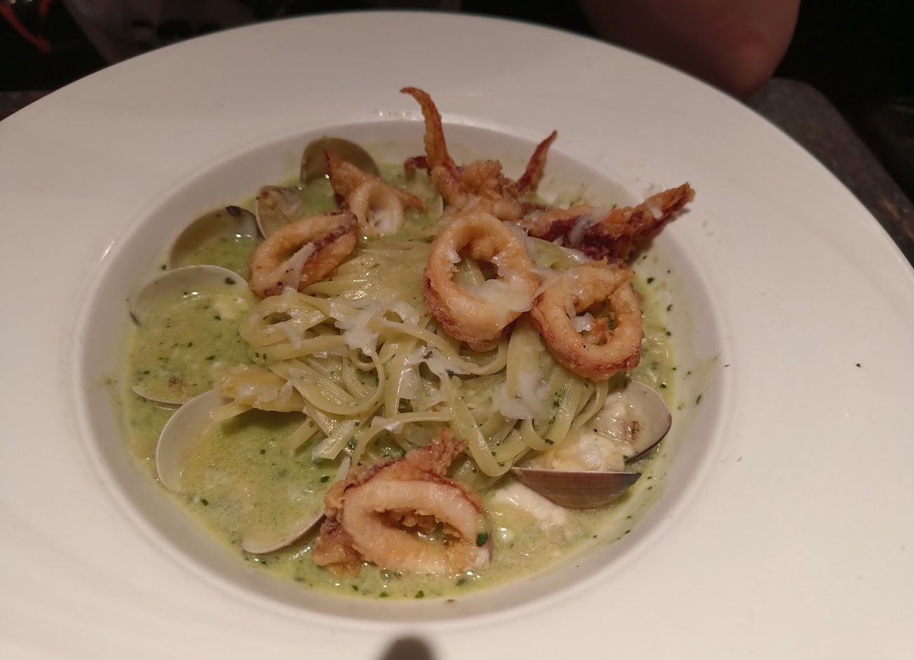 義大利麵是品嚐烏賊墨海鮮扁麵,麵條口感滑順咕溜,味道鹹度剛好,不錯吃,而我個人比較喜歡燉飯系列,滿推薦松露風野菇起士燉飯,因為燉飯的口感QQ的,每一粒米都沾附sauce,有被松露香到,真的好好吃喔!