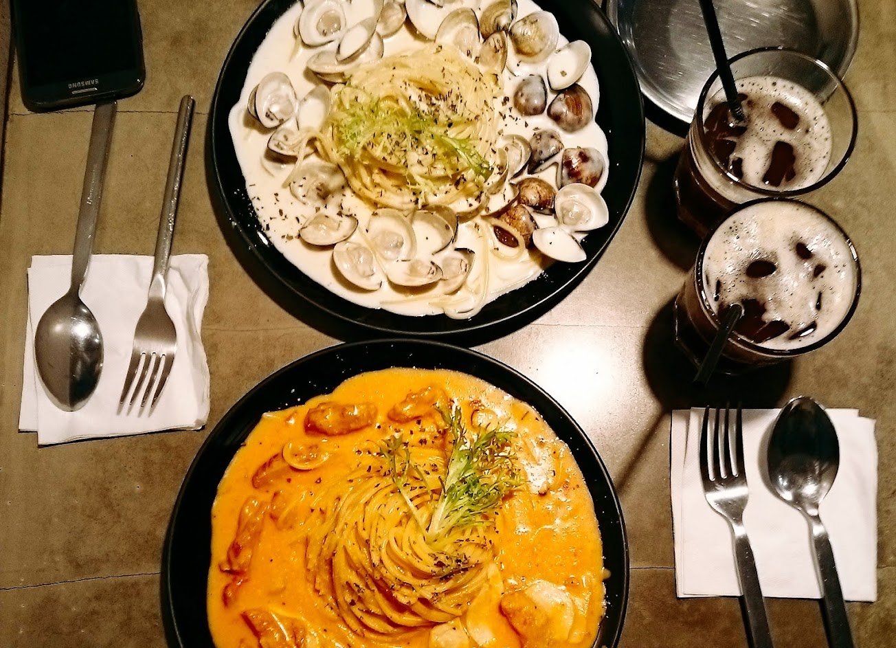 最有名最必點的是橘醬跟蛤蜊義大利麵,橘醬是朋友點的,有加麵(免費加);我點的是超級多蛤蜊的義大利麵,沒有加麵。料的部分都給的很澎湃,份量的話,男生加麵一定吃得飽,女生如果食量沒有很大,不加麵也夠吃了。