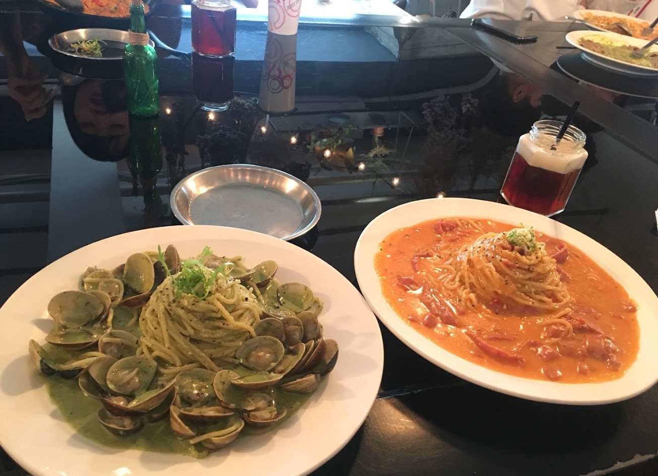 HUN 橘醬雞腿肉義大利麵、蒜香辣味爆炸蛤蠣義大利麵、加點泡菜