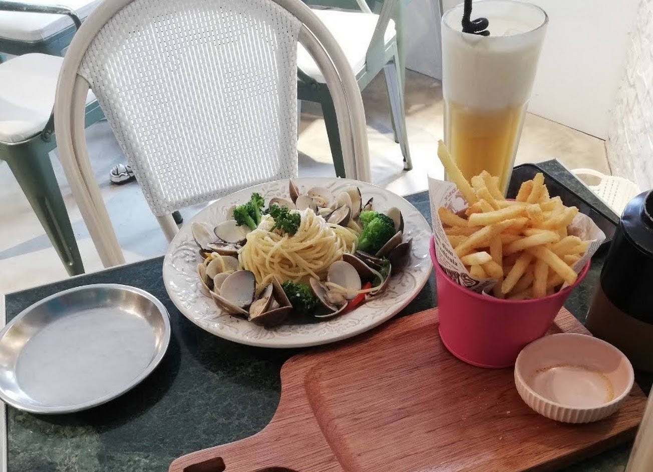 義大利麵可以免費加麵,不過附餐的飲料好小杯。換成大杯的折50元,這樣比較好講話不會口渴,義大利麵蠻好吃的,蛤蜊真的放很多