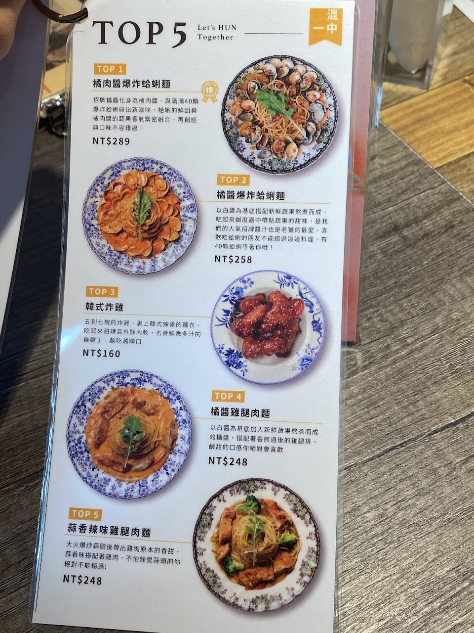 1.辣橘醬椒麻雞胸義大利麵:不會太辣,雞胸很嫩上面有花椒會吃到,但是不辣,好吃。2.橘醬美式雞腿義大利麵:是不會辣的,跟第一個比起來,我比較喜歡第一個的肉的味道。3:白醬培根義大利麵:白醬很濃郁,培根切的小小的,好入口,很好吃。4:辣橘醬海鮮義大利麵:蛤蠣十幾顆左右,兩隻新鮮口感扎實的蝦子,一些透抽(或小卷)切圈,好吃。單點一盤蜂蜜芥末醬炸雞塊(8塊$160),沾著醬吃很美味。各含一杯免費不鏽鋼高腳杯裝的冰紅茶,點了四盤義大利麵,都很讚,要預約比較不用等。
