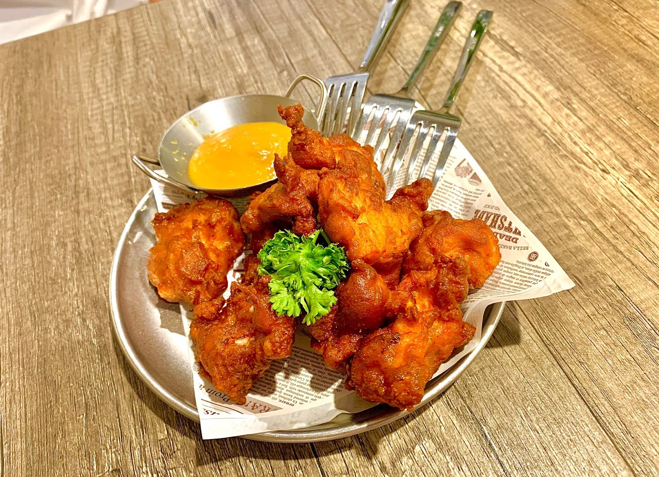 #法式蜂蜜芥末脆皮炸雞 :外皮的脆與雞肉的嫩成強烈對比,蘸上蜂蜜芥末醬,風味整體提升,芥末感不會過重,搭上蜂蜜及肉汁的甜,直接清盤。