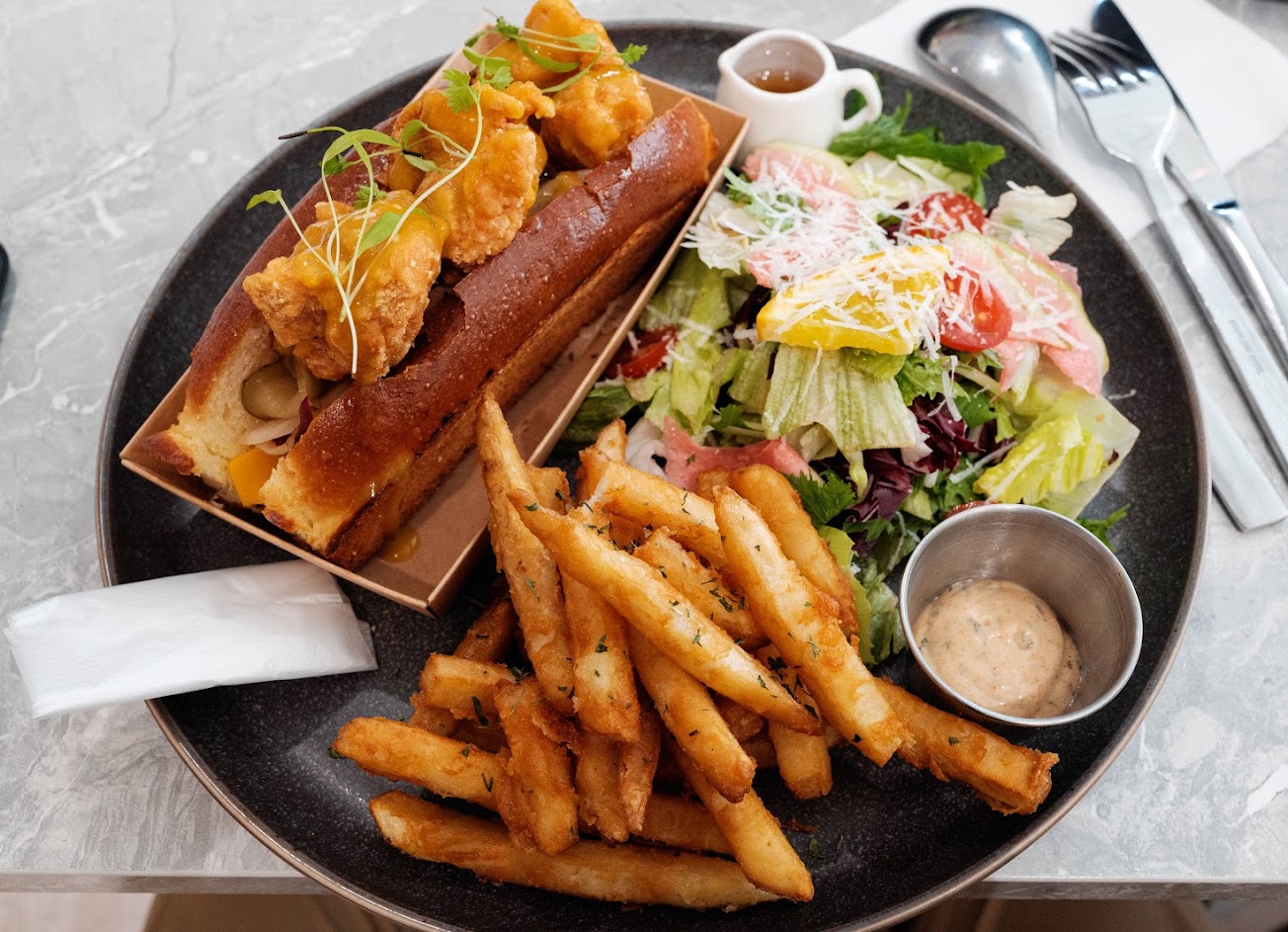 二訪薯條變鹹也變油了,很可惜,第一次來比較好吃,沙拉醋太多。第一次跟第二次都有點雞腿漢堡超好吃,莎莎醬普通,鮭魚可頌看起來不錯。同行友人表示方塊的那顆手工麵包很好吃