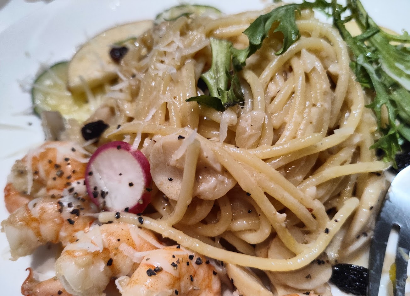 味道濃郁口感適中,配菜有櫛瓜&溏心蛋加分,蝦仁沒有溫度也沒與麵和醬融合 不過醬太好吃了瑕不掩瑜!
