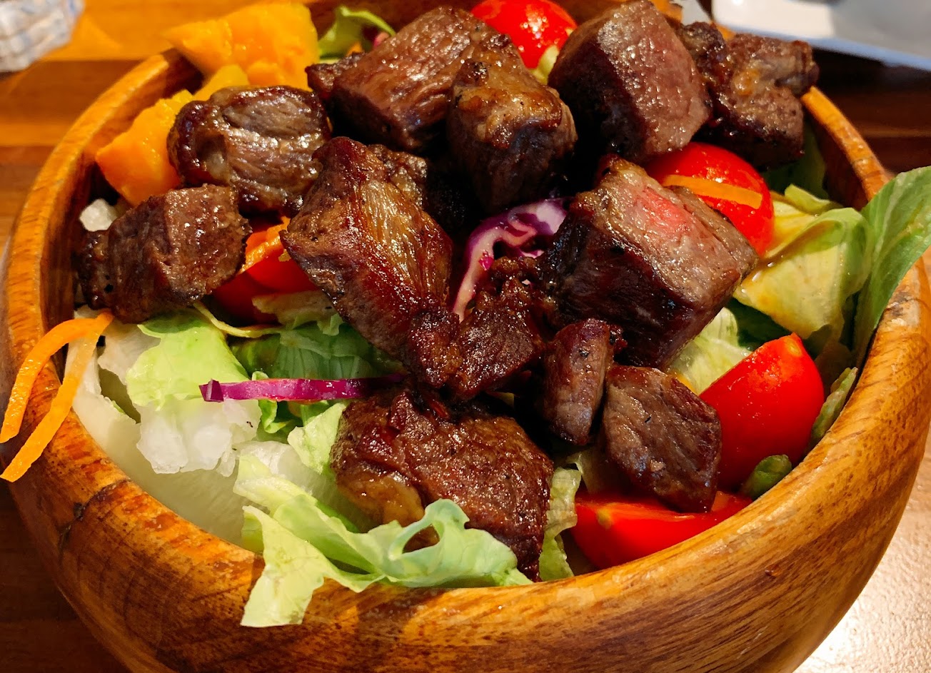 點骰子牛沙拉 牛肉有嚼勁很好吃 沙拉很新鮮 脆薯現炸很香 很棒?